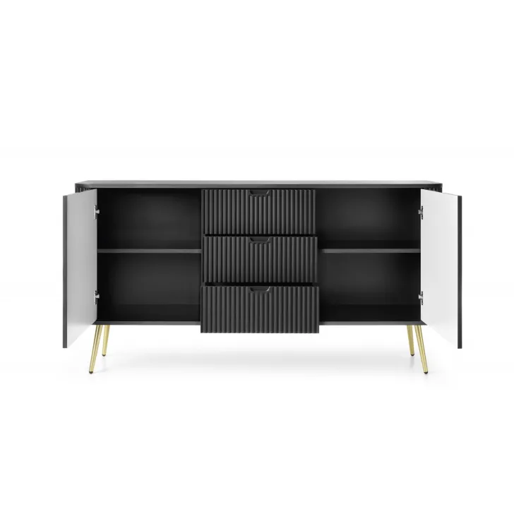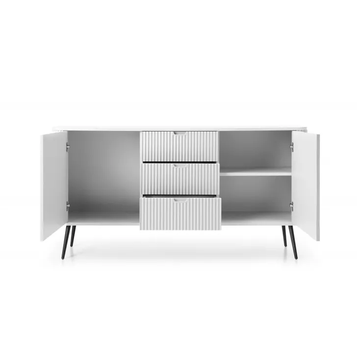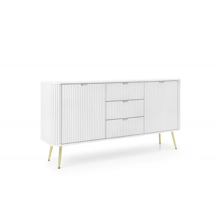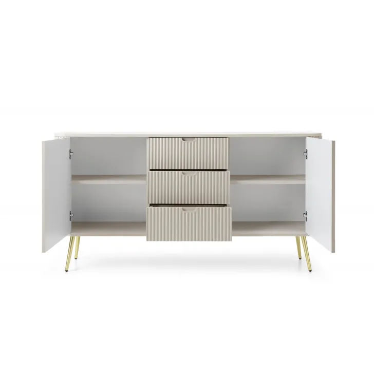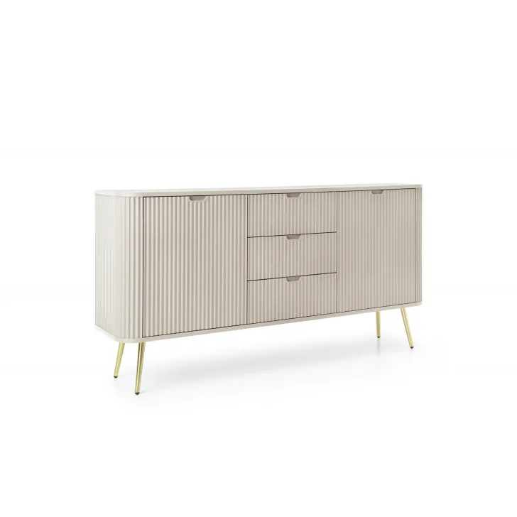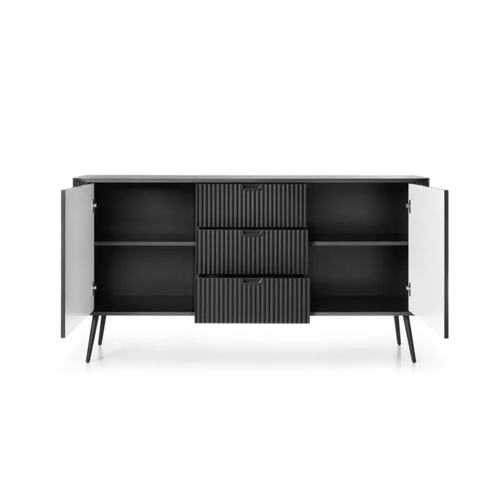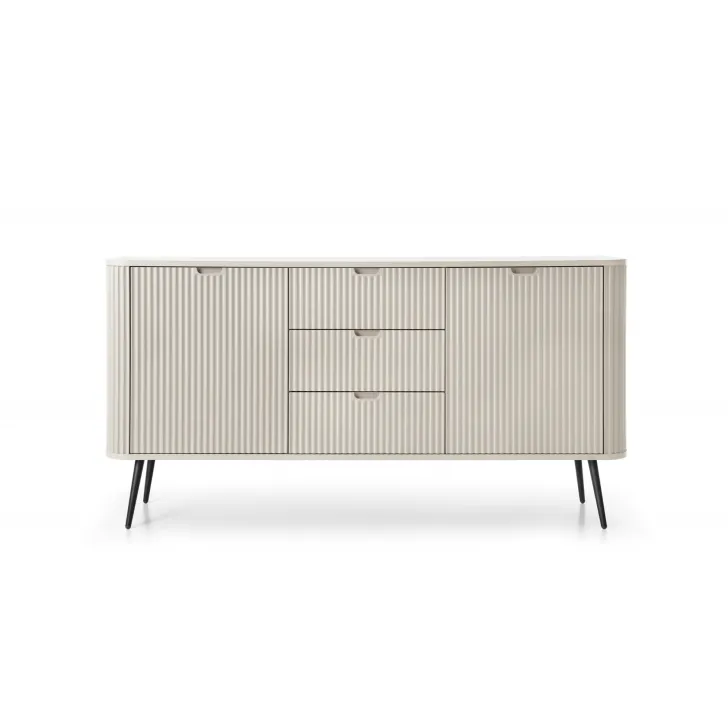 Wir präsentieren die Kommode 168 cm ZOYA mit geriffelten Fronten – die perfekte Wahl für alle, die Funktionalität und moderne Ästhetik miteinander verbinden möchten. Diese Kommode mit drei geräumigen Schubladen und zwei Fächern hinter soliden Türen bietet viel Stauraum, während ihr Design sie zu einem echten Highlight in jedem Raum macht.