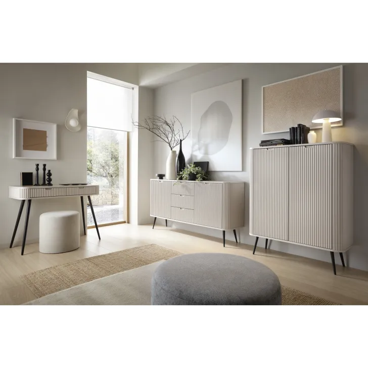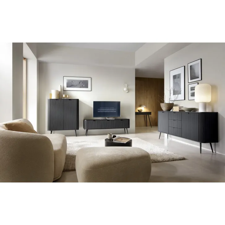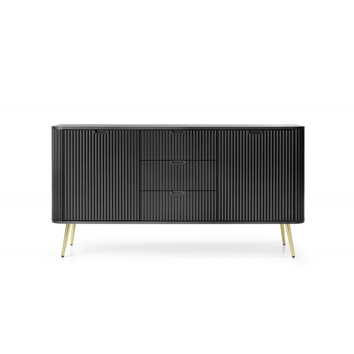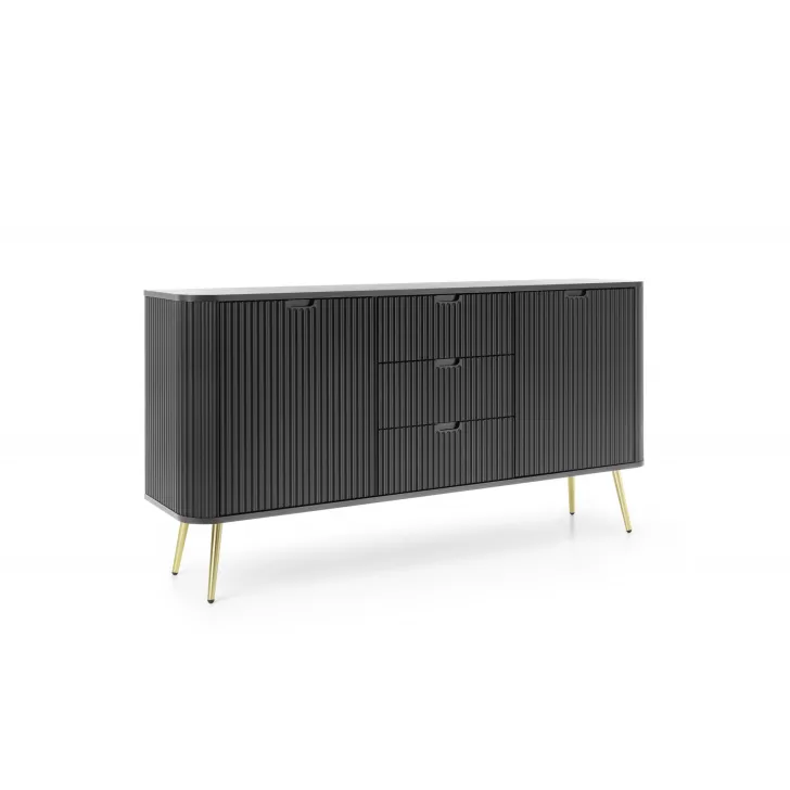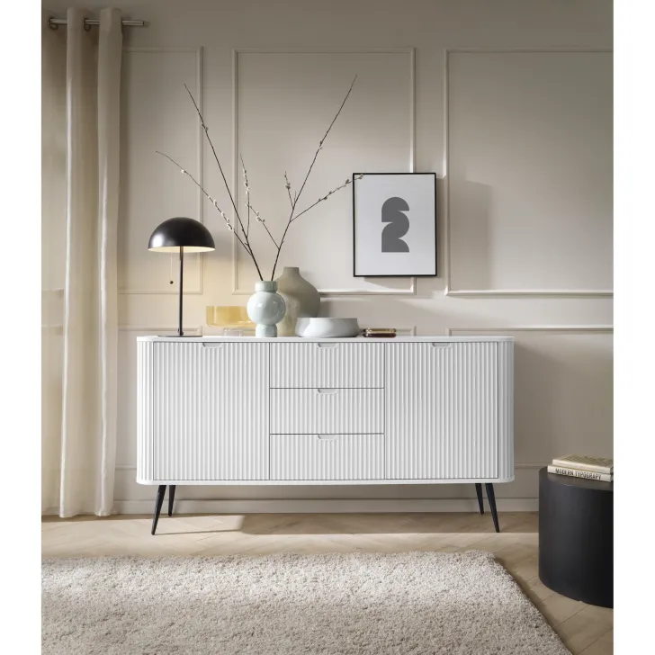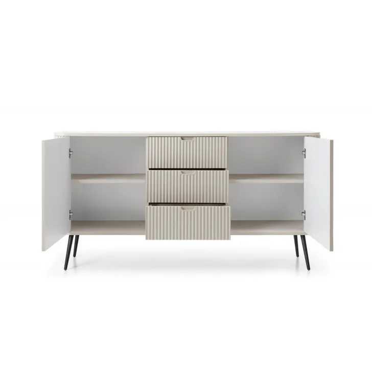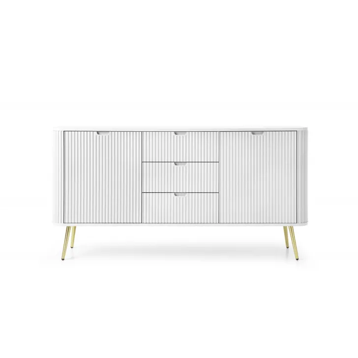 Wir präsentieren die Kommode 168 cm ZOYA mit geriffelten Fronten – die perfekte Wahl für alle, die Funktionalität und moderne Ästhetik miteinander verbinden möchten. Diese Kommode mit drei geräumigen Schubladen und zwei Fächern hinter soliden Türen bietet viel Stauraum, während ihr Design sie zu einem echten Highlight in jedem Raum macht.