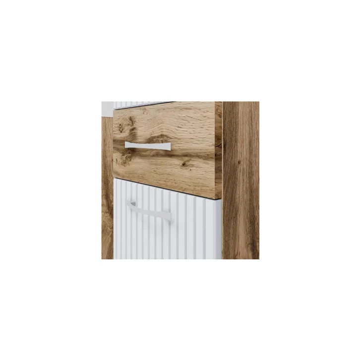Die Fronten der Möbel bestehen aus MDF-Platten in Weiß mit einem 3D-Riffelmuster, während die Oberplatten und Korpusse aus 15 mm starker, laminierter Platte im eleganten Farbton Eiche Wotan gefertigt sind. Zudem verleihen Metallgriffe und mit ABS-Kanten versehene Ränder den Möbeln ein modernes und stilvolles Aussehen.