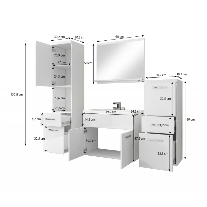 - Waschbeckenschrank: Höhe 47,5 cm, Breite 60 cm, Tiefe 34,6 cm