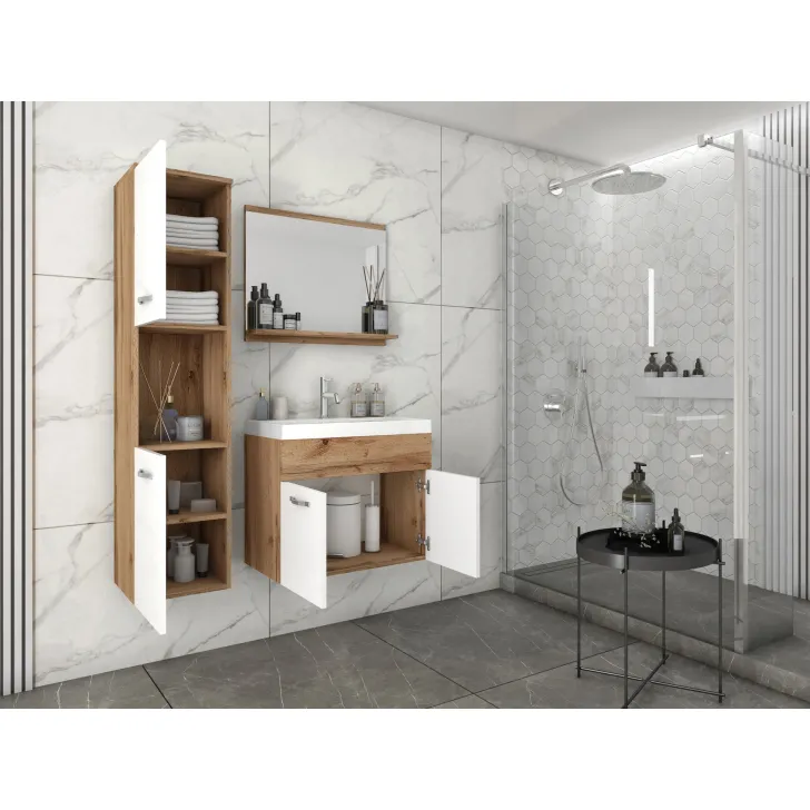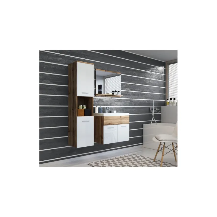 Entdecken Sie die Schönheit moderner Eleganz mit dem Badezimmermöbelset „MONAL“, das eine perfekte Kombination aus Funktionalität und Stil verkörpert. Die Farbe Eiche Wotan offenbart ihre einzigartige, natürliche Maserung und warmen Farbtöne, die in idealem Kontrast zum weißen Hochglanz stehen und dem Raum Leichtigkeit und Frische verleihen. Dieses Set fügt sich mühelos sowohl in traditionelle als auch in moderne Badezimmer ein und bietet eine praktische Organisation bei gleichzeitig hohem ästhetischem Anspruch. Das „MONAL“-Set wurde mit Blick auf Funktionalität entworfen und besteht aus Möbeln aus 15 mm starker, laminierter Platte, was ihre Langlebigkeit und Feuchtigkeitsbeständigkeit garantiert. Metallgriffe erhöhen die Benutzerfreundlichkeit, während ABS-Kanten für zusätzliche Haltbarkeit sorgen.