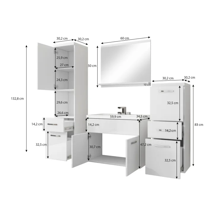 - Waschbeckenschrank: Höhe 47,5 x Breite 60 x Tiefe 34,6 cm