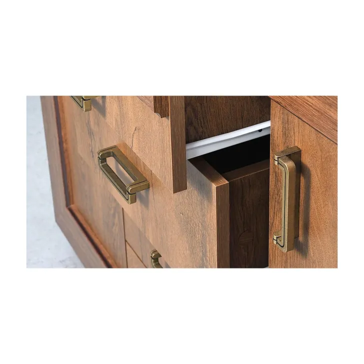 Die Kommode besteht aus zwei praktischen und stilvollen Schränken sowie vier Schubladen mit Rollführungen. Diese Kombination sorgt dafür, dass alle wichtigen Dinge stets griffbereit sind. Sowohl die Fächer als auch die Schubladen sind äußerst geräumig – dein Wohnzimmer bleibt jederzeit ordentlich und aufgeräumt.
