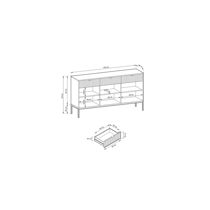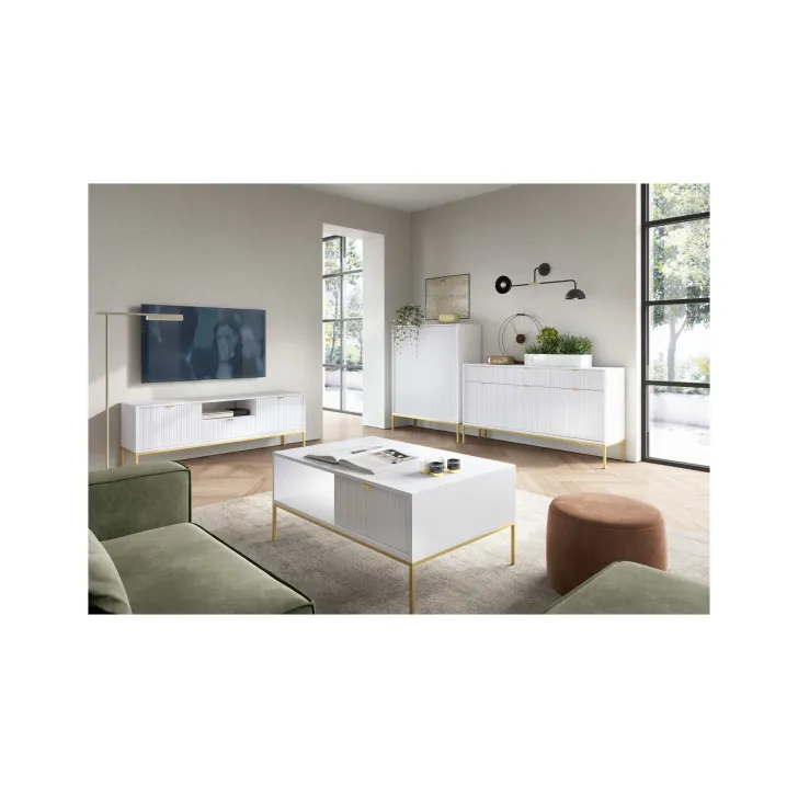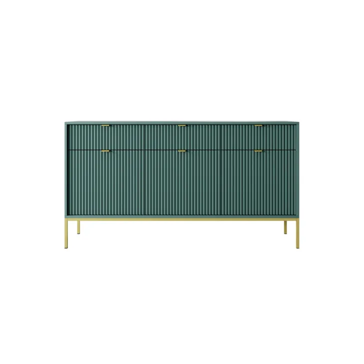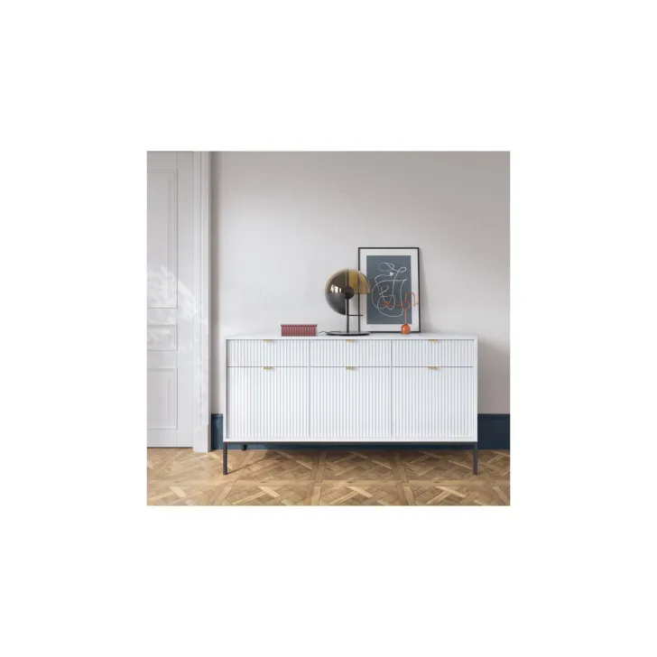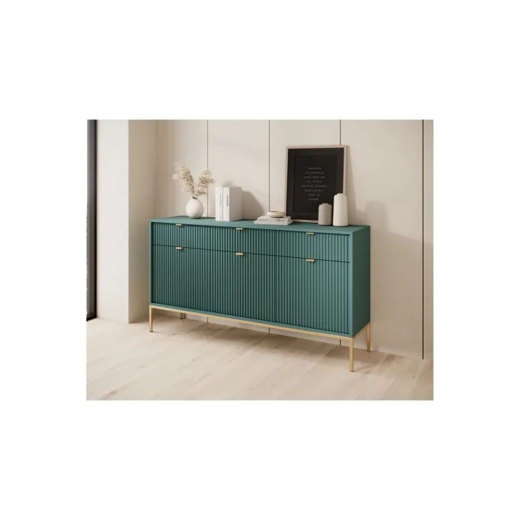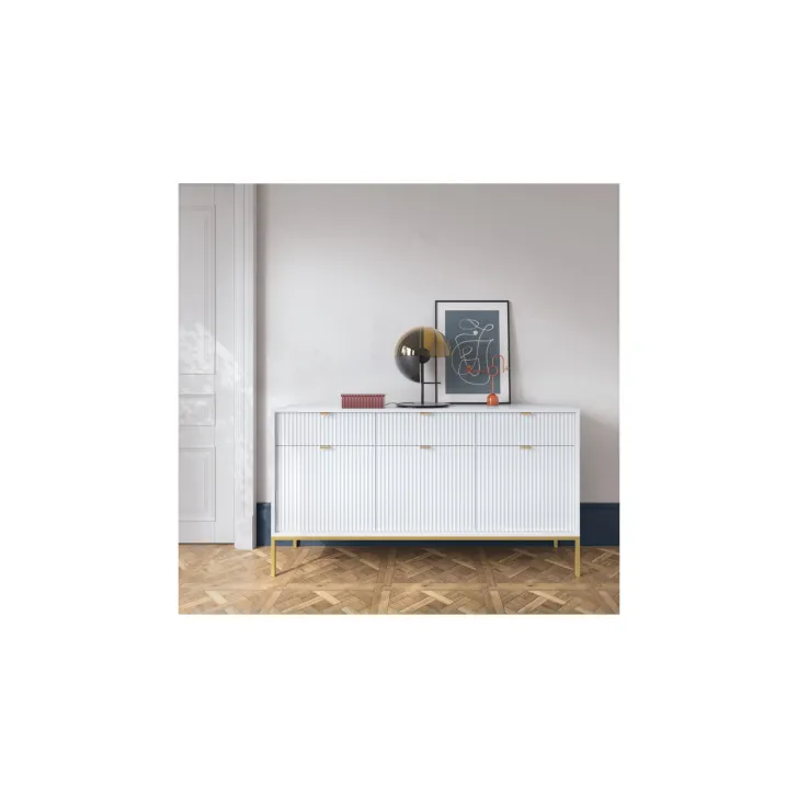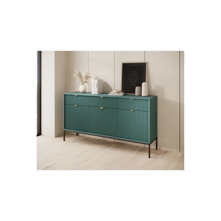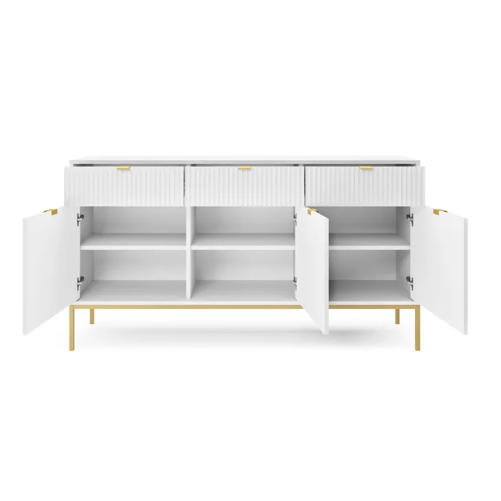 Präsentieren Sie Ihr Zuhause von seiner besten Seite mit der modernen, raffinierten und eleganten Kommode „NOVA“ auf Metallbeinen. Ob im Wohnzimmer oder Schlafzimmer – diese hochwertige Kommode mit Türen und Schubladen vereint Funktionalität mit auffälligem Design.