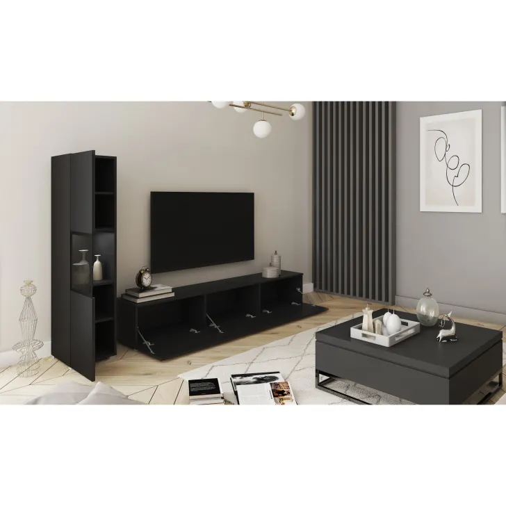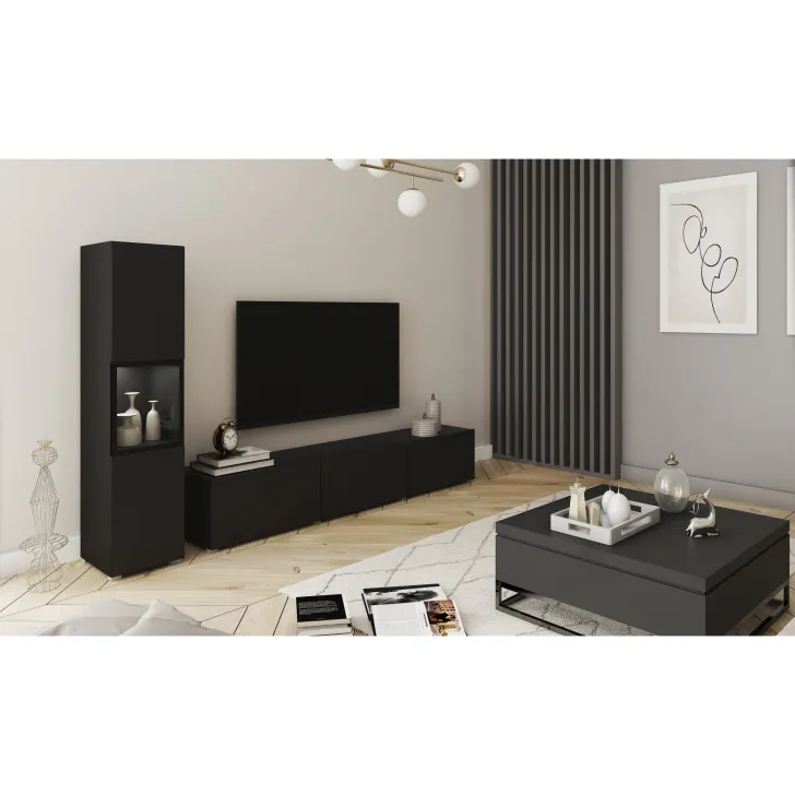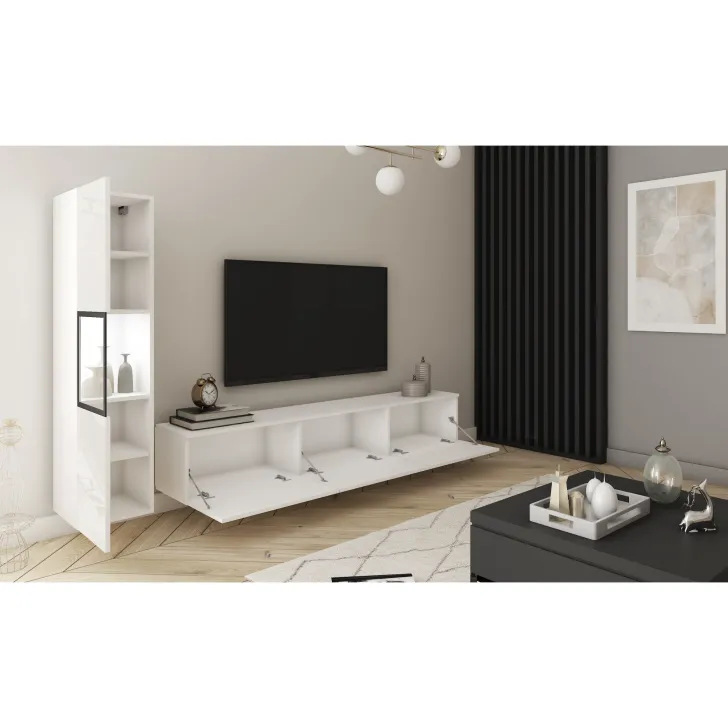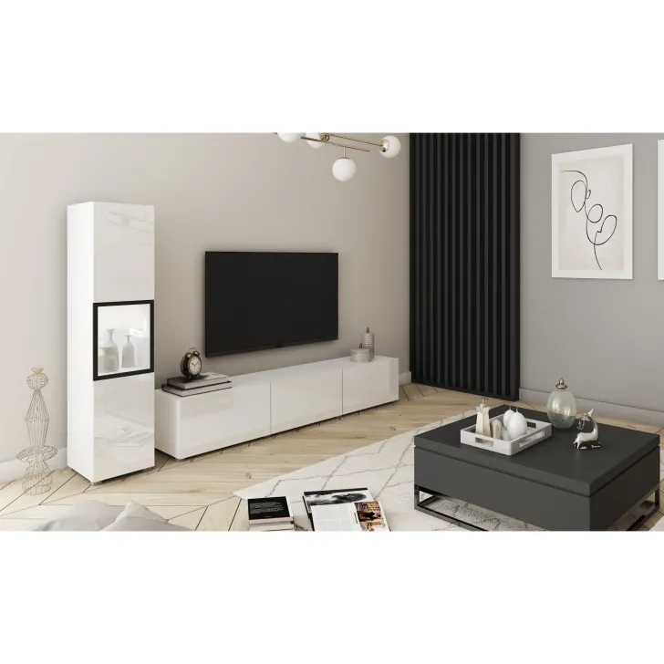 Die Wohnwand besteht aus hochwertiger 15 mm dicker Laminatplatte, deren Kanten mit strapazierfähigem ABS-Kantenband versehen sind. Die Kunststofffüße in Aluminiumoptik verleihen dem Möbelstück Leichtigkeit und einen modernen Look. Bei Modellen mit Hochglanzfronten sind diese aus 15 mm POLYGLOSS-Platte gefertigt, während die Rückwände aus HDF-Platten bestehen, die farblich an die Möbelkörper angepasst sind. Die Türen der Vitrine enthalten eine Glasscheibe - gehärtetes Glas in einem lackierten Rahmen. Die optionale weiße LED-Beleuchtung sorgt für zusätzlichen Charme in den Abendstunden.
