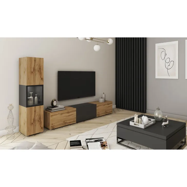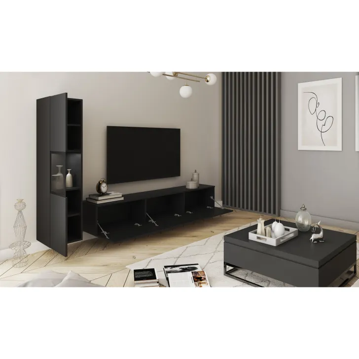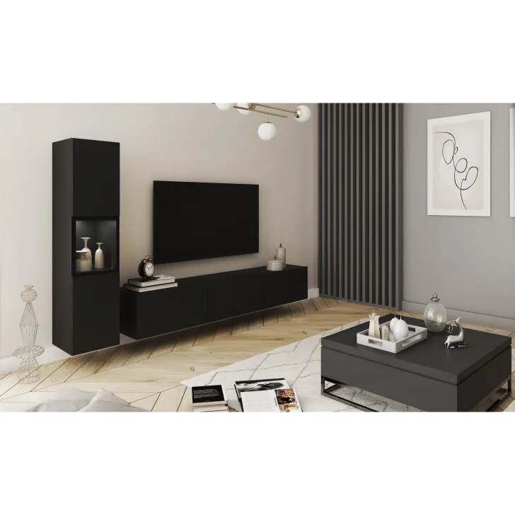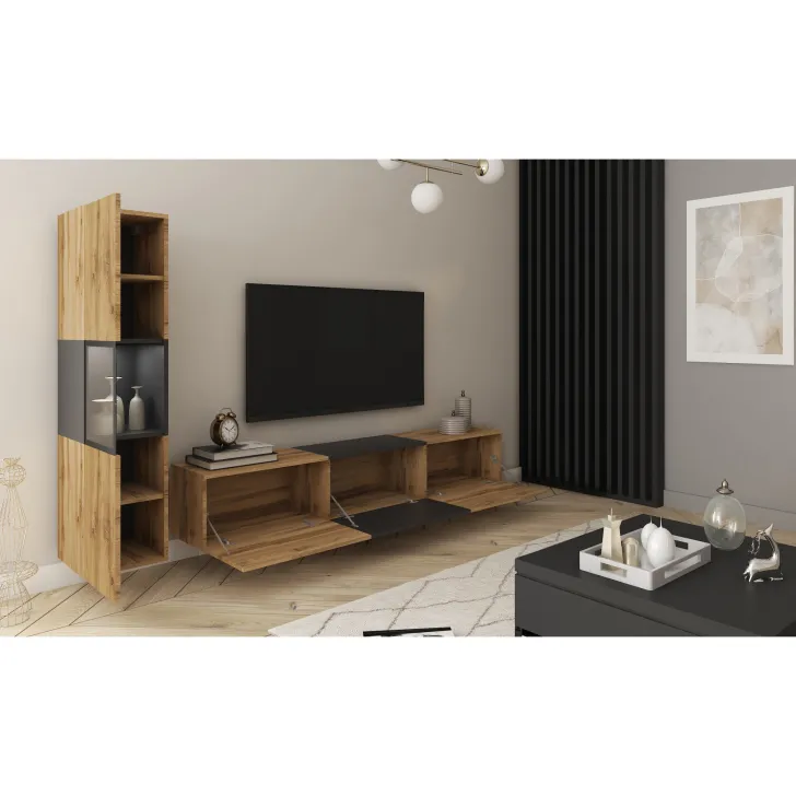 Die Wohnwand BRELA I ist ein außergewöhnliches, modernes und multifunktionales Set, das Ihnen nicht nur Komfort bietet, sondern auch praktische Aufbewahrungslösungen. Durch die Möglichkeit, es an der Wand aufzuhängen oder auf Füßen zu stellen, ist dieses Möbelstück eine hervorragende Lösung für selbst die kleinsten Räume. Mit Fokus auf Funktionalität, schickem Aussehen und einfacher Form ist es perfekt für jedes Interieur.