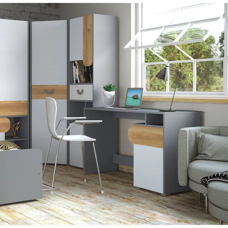 Ein besonderes Merkmal dieses Modells ist die großzügige Arbeitsfläche, die die Qualität Ihrer Arbeit erheblich verbessert. Hinter der Tür befindet sich ein zusätzliches Regal zur Aufbewahrung von Dokumenten, Büchern oder Notizen – ideal, um den Arbeitsbereich individuell zu organisieren.