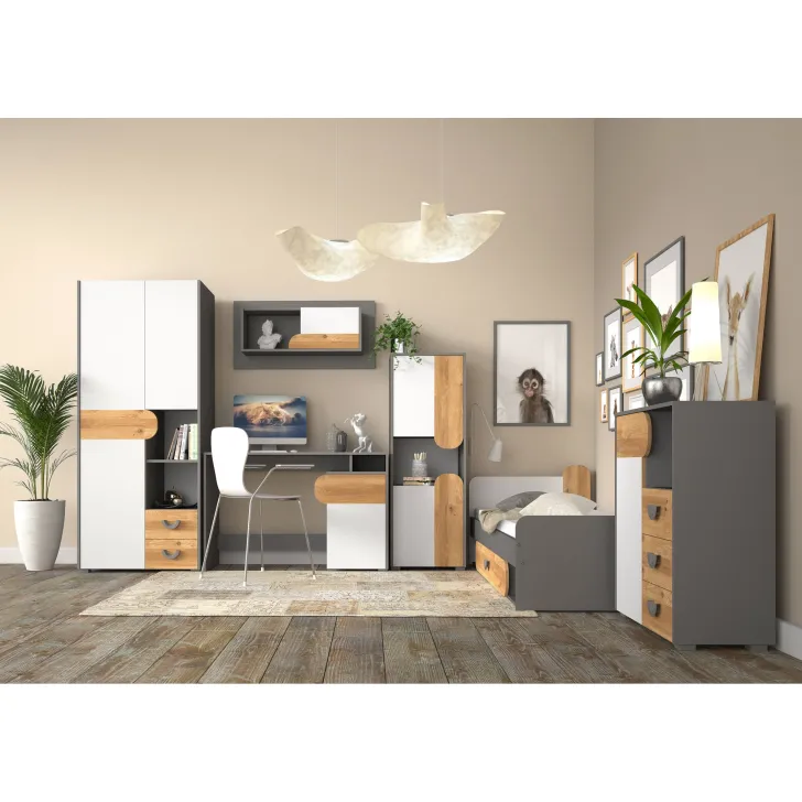 Der Schreibtisch Carina Eiche Nash / Weiß / Hellgrau wurde für Nutzer konzipiert, die Wert auf Ergonomie, Funktionalität und Ästhetik legen. Er ist ideal für Jugendliche und das Homeoffice und verwandelt jeden Raum in einen komfortablen Ort zum Arbeiten und Lernen.