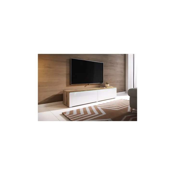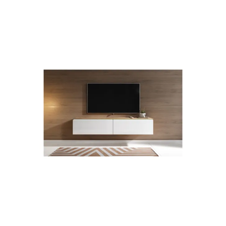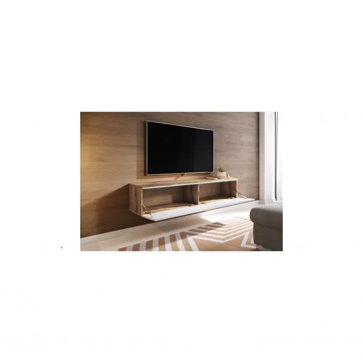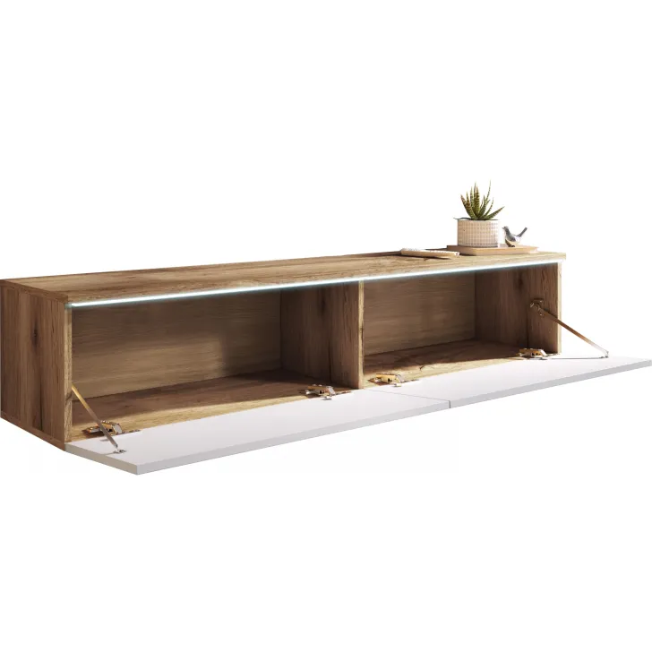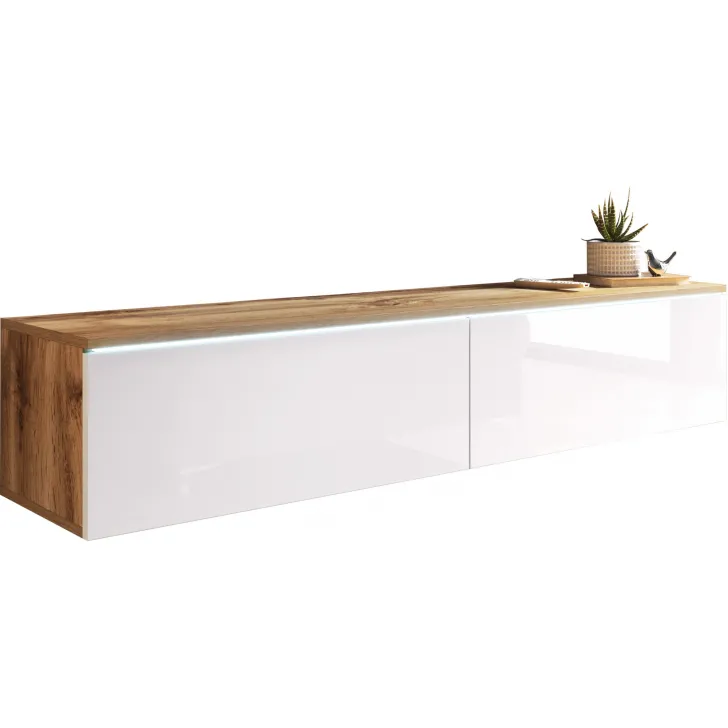 Wir präsentieren Ihnen ein TV-Lowboard mit einer Breite von 140 cm in eleganter Farbkombination Eiche Wotan / Weiß Hochglanz – ein Möbelstück, das Funktionalität, Modernität und Stil miteinander vereint. Dieses einzigartige TV-Möbel, das durch seine hochwertige Verarbeitung überzeugt, kann entweder an der Wand montiert oder auf silbernen Füßen aufgestellt werden. So eignet es sich ideal für kleine wie große Räume.
