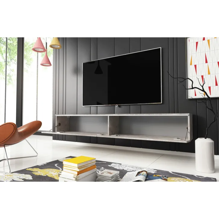 Verleihen Sie Ihrem Wohnzimmer einen einzigartigen Charakter mit unserem TV-Schrank im Loft-Design. Dieser zeitlose Schrank in attraktiver Betonoptik ist die perfekte Wahl für Liebhaber minimalistischer Einrichtungen. Er ist besonders praktisch und funktional – ein stilvoller Mittelpunkt des Raumes, der zudem für Ordnung sorgt und zusätzlichen Stauraum bietet.