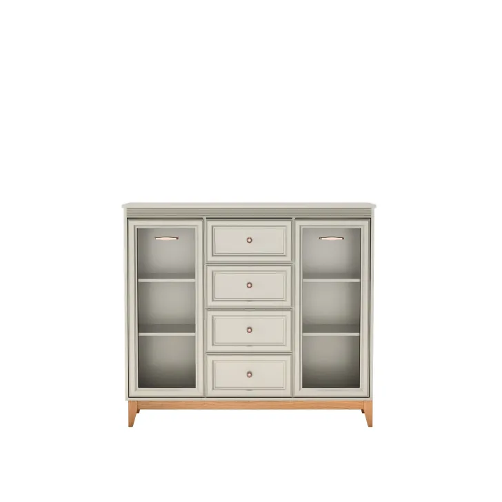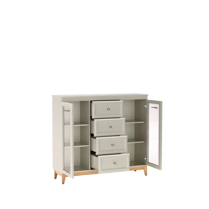Besonders hervorzuheben ist das durchdachte Innenleben der Kommode. Die verglasten Fronten auf beiden Seiten des Möbels ermöglichen es, Bücher, Geschirr oder dekorative Accessoires elegant in Szene zu setzen. In der mittleren Sektion sorgen praktische Schubladen für schnellen Zugriff auf Kleidung, Dokumente oder kleine Gegenstände.