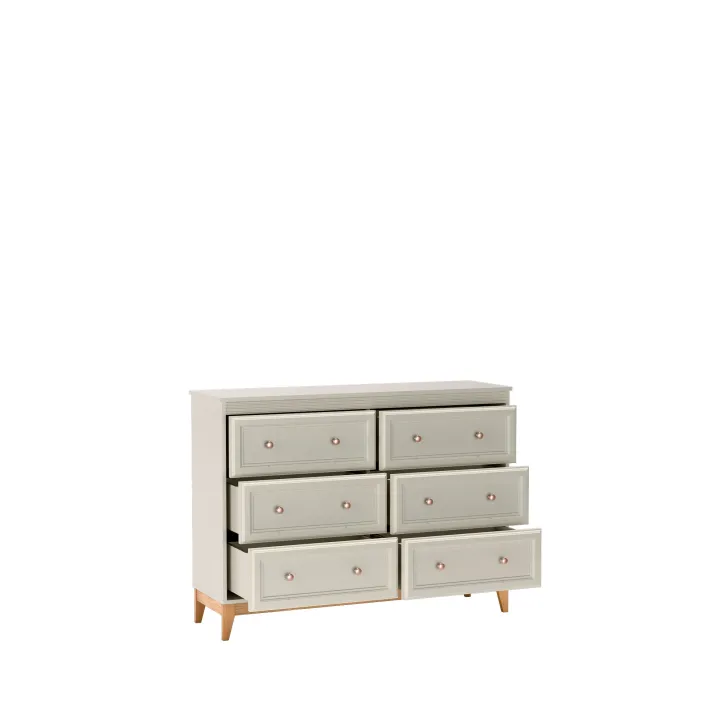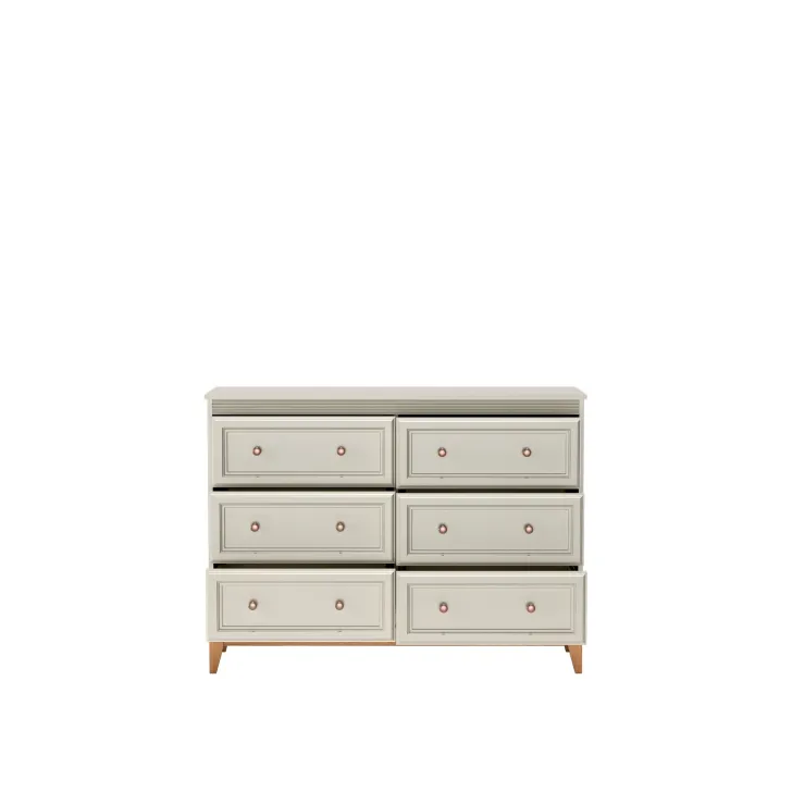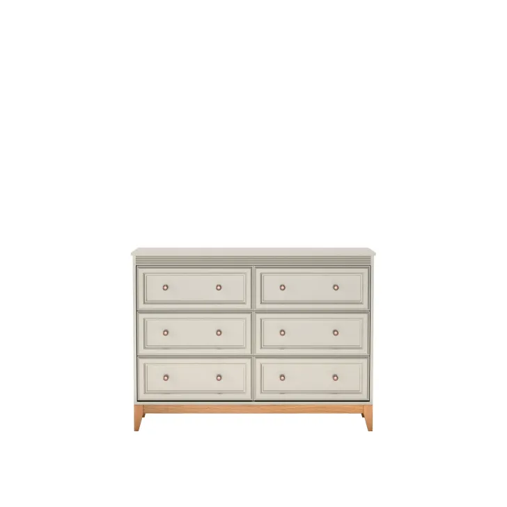 Die Frontpartie der Kommode besteht aus gefräster MDF-Platte, deren feine Linien besonders edel wirken. Die Kombination von natürlichem Holz und dem Farbton Kaschmir verleiht dem Möbelstück Leichtigkeit, während die dekorativen Leisten an der Front klassische Akzente setzen. Die Griffe in Kupferoptik unterstreichen den edlen Charakter, und die stabilen Beine aus massivem Eichenholz garantieren Langlebigkeit und natürliche Schönheit.