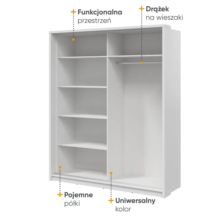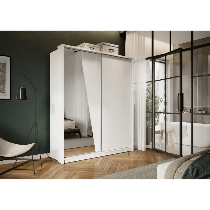 Zwei Schiebetüren erleichtern den Zugang zum Schrankinneren und ermöglichen eine optimale Raumnutzung. Besonders hervorzuheben ist das Spiegelelement an einer der Türen, das den Raum optisch vergrößert und den Alltag durch schnelle Outfit-Kontrollen erleichtert.