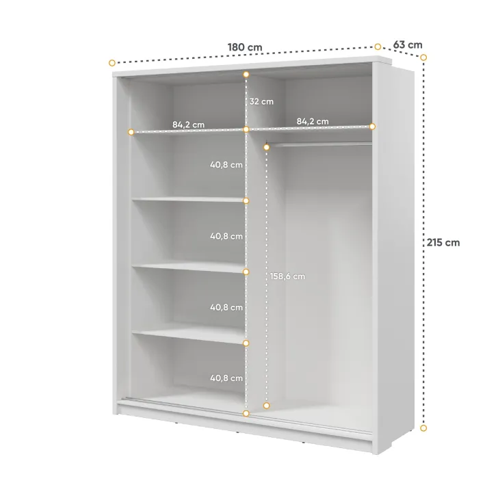 Im Inneren befinden sich eine Metallkleiderstange sowie mehrere geräumige Einlegeböden, die das Organisieren und Sortieren besonders einfach machen. Der Schrank ist zudem mit Befestigungslöchern an Rück- und Seitenwänden ausgestattet, wodurch er sicher an der Wand montiert werden kann – für mehr Stabilität und geringeres Kipp-Risiko.
