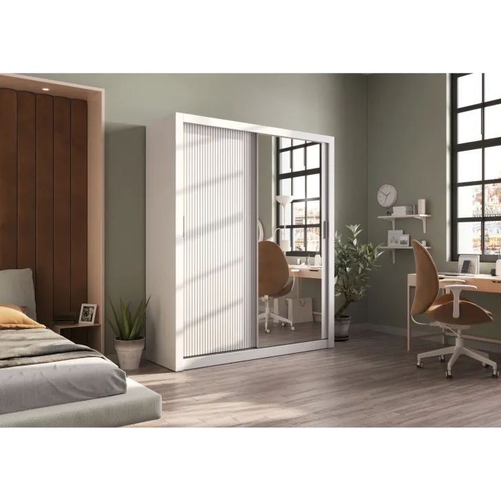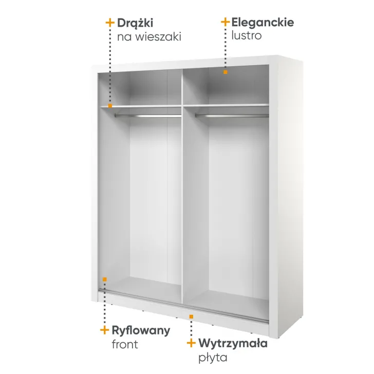 Der Kleiderschrank ERTA 28 besteht aus 16 mm starker laminierter Spanplatte. Die Fronten sind aus MDF-Platten mit geriffeltem Muster gefertigt (18 mm stark) und mit widerstandsfähigen ABS-Kanten versehen. Das Möbel ist in einem universellen, stets modernen Weißton gehalten, was es perfekt für sowohl moderne Lofts als auch klassische Innenräume macht.