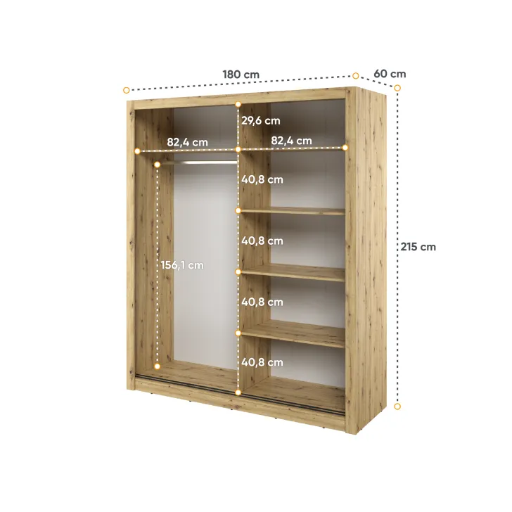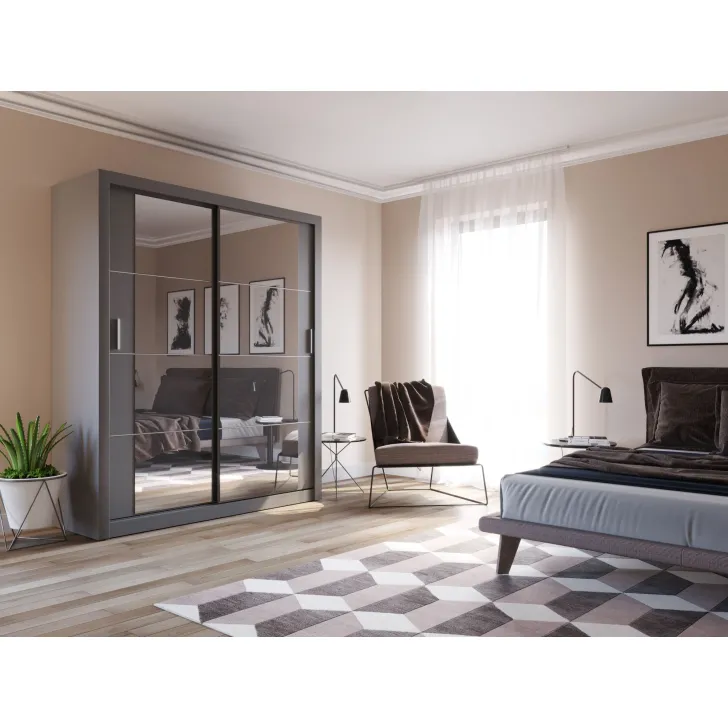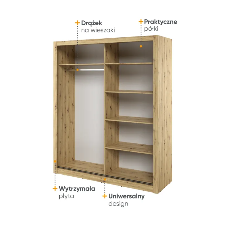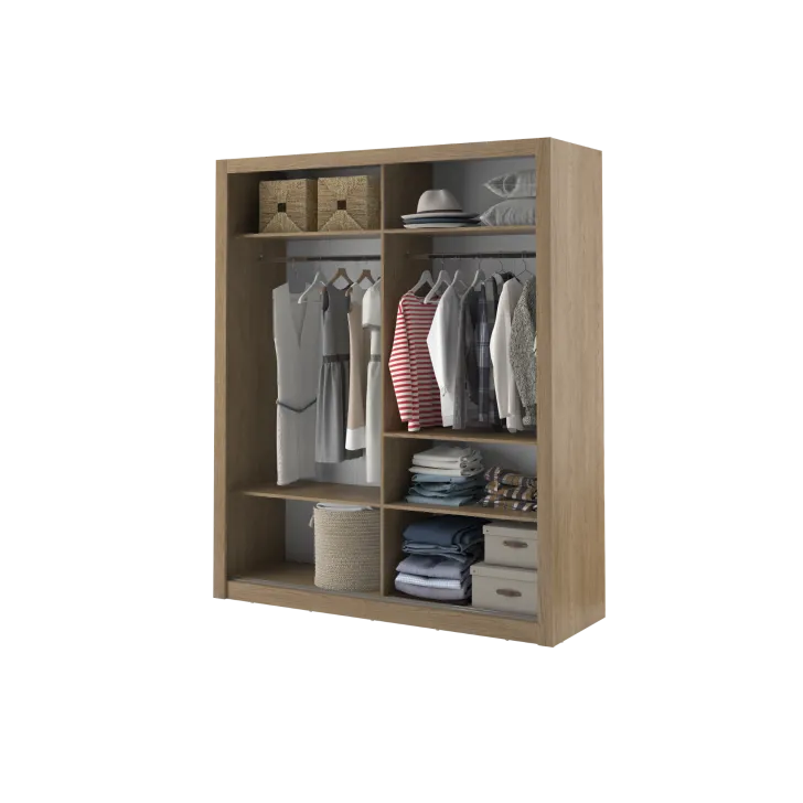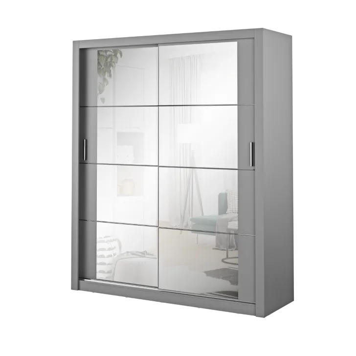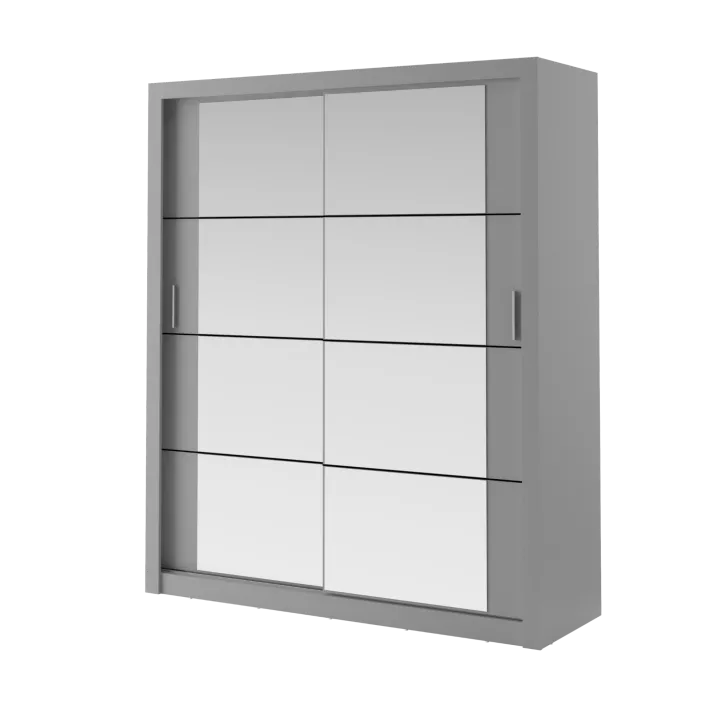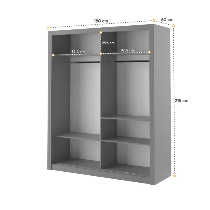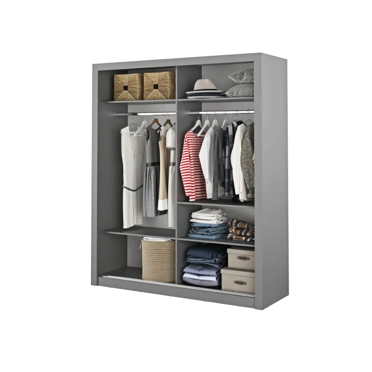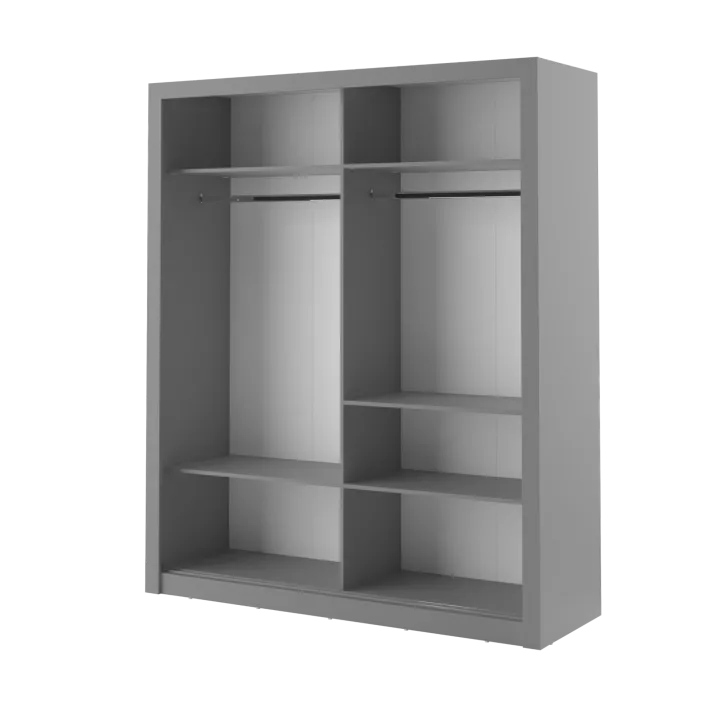 Der Kleiderschrank ERTA 3 zeichnet sich durch ein minimalistisches Design und eine universelle Farbgebung aus, wodurch er sich harmonisch in jedes Interieur einfügt – egal ob modern oder klassisch. Ausgestattet mit zwei Schiebetüren bietet er nicht nur bequemen Zugriff auf das Innere, sondern spart auch Platz im Raum.