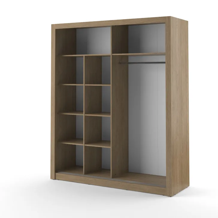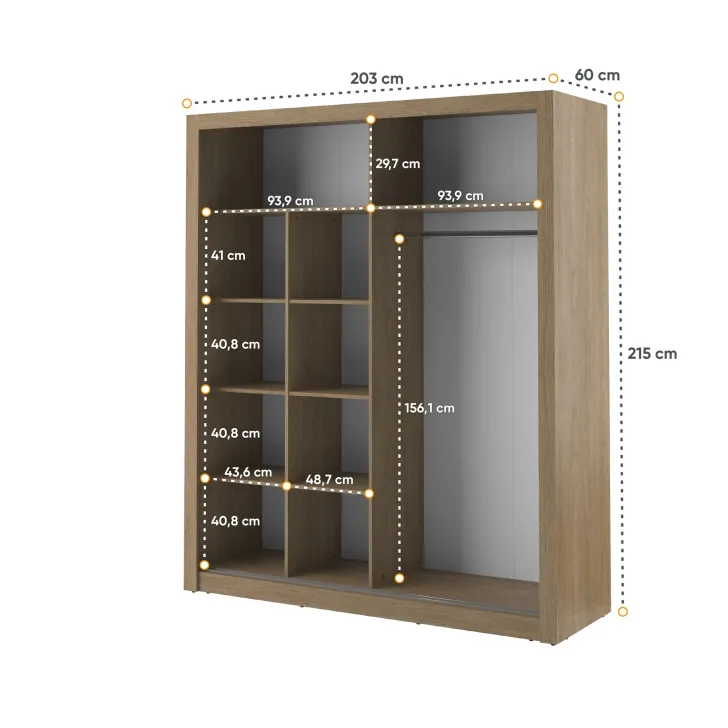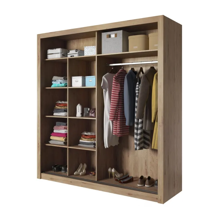 Besonders hervorzuheben sind die beiden Schiebetüren, die Platz sparen und eine einfache Handhabung ermöglichen. Im Inneren befinden sich eine lange Kleiderstange, zwei seitliche Regale mit Einlegeböden sowie geräumige obere Fächer. Letztere eignen sich ideal zur Aufbewahrung von Saisonartikeln, Schuhen oder sogar Koffern.