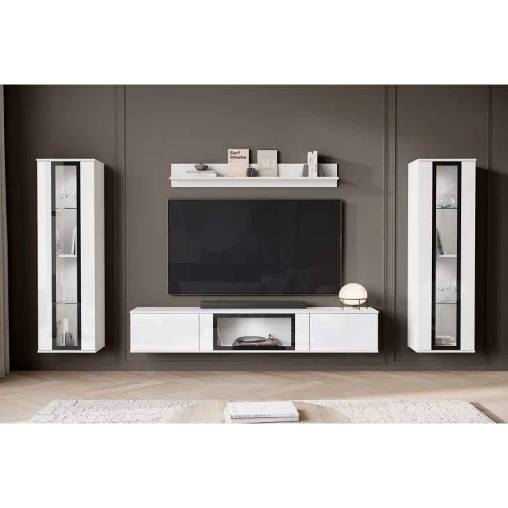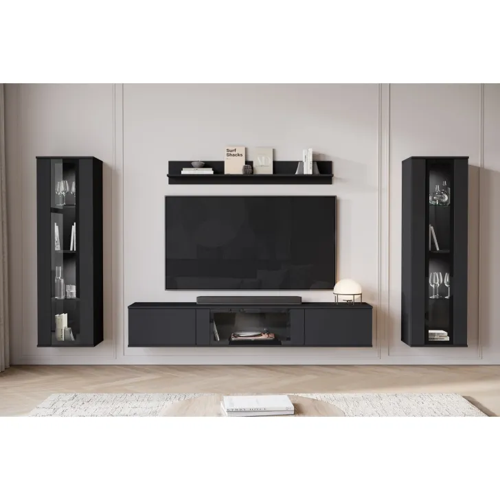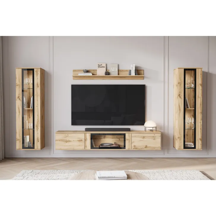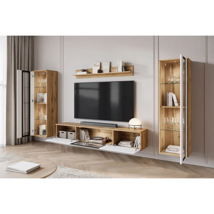 Die beliebte Wohnwand FARO ist definitiv ein modernes Update für das klassische Möbelstück. Weit entfernt von alten Vorstellungen schwerer, unpraktischer Möbel, bringt unser Angebot eine wahre Revolution in die Gestaltung Ihres Wohnzimmers. Die Wohnwand FARO bietet vor allem Komfort und Funktionalität, egal ob sie an der Wand hängt oder auf Füßen steht - sie gibt Ihnen die völlige Freiheit bei der Entscheidung, wie Sie sowohl kleine als auch größere Räume dekorieren möchten. Dieses 4-teilige Set bietet zahlreiche Aufbewahrungsmöglichkeiten und präsentiert gleichzeitig perfekt Ihre Lieblingsdekorationen. Die seitlichen Vitrinen mit teilweise verglasten Türen enthalten Regale, auf denen Sie Ihr Geschirr oder andere einzigartige Dekorationen hervorragend ausstellen können. Der TV-Schrank bietet praktischen Stauraum, der hinter Türen verborgen ist, die von oben nach unten mit Klappen geöffnet werden. Darüber hinaus wurde in der mittleren Schranksektion eine Verglasung eingefügt, die perfekt für die Präsentation zusätzlicher Dekorationen oder Bücher ist.
