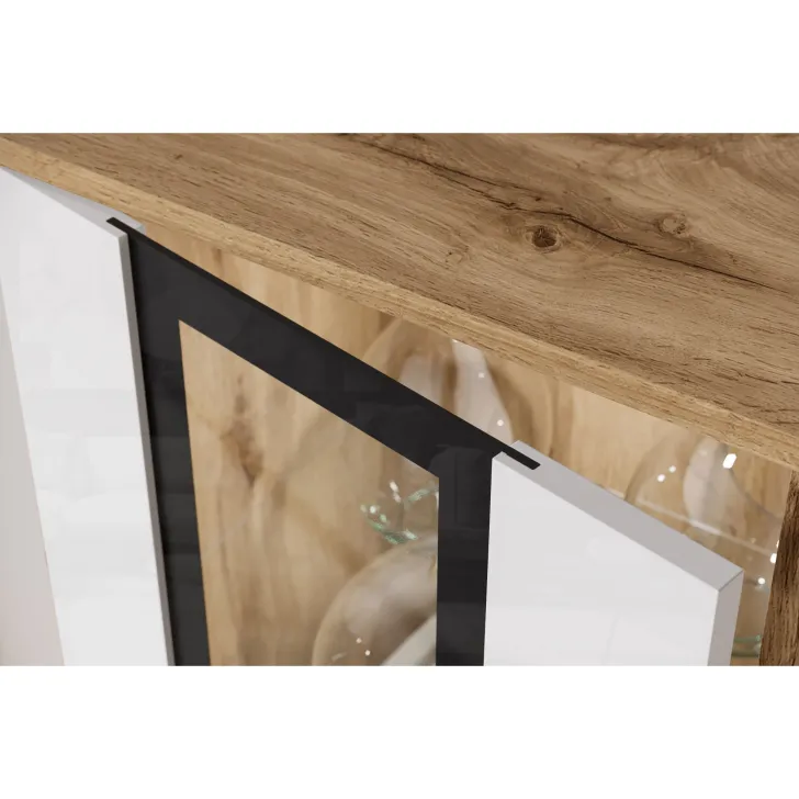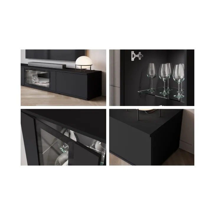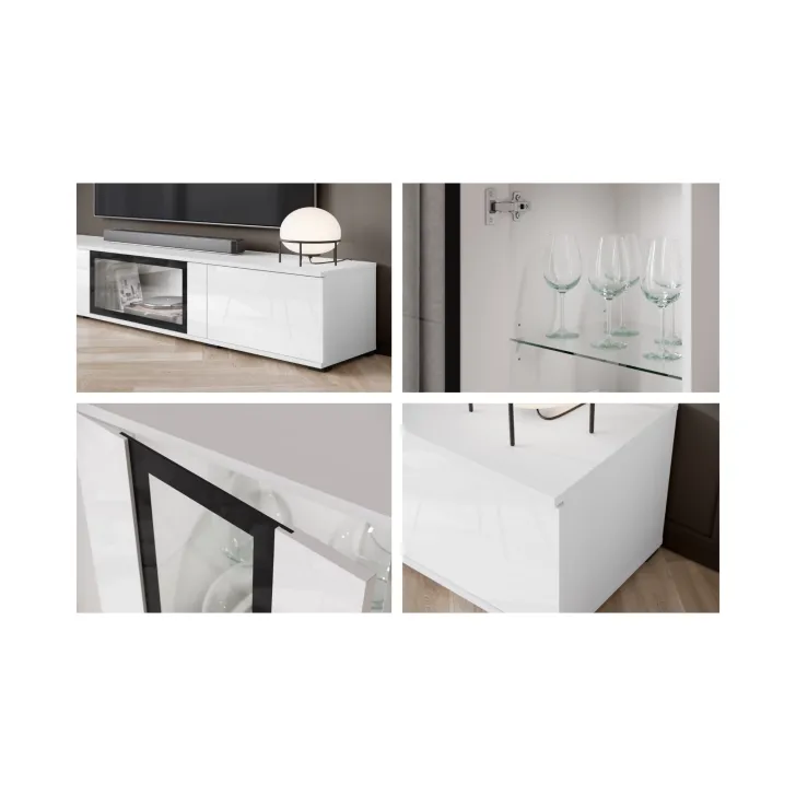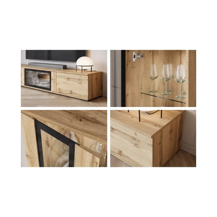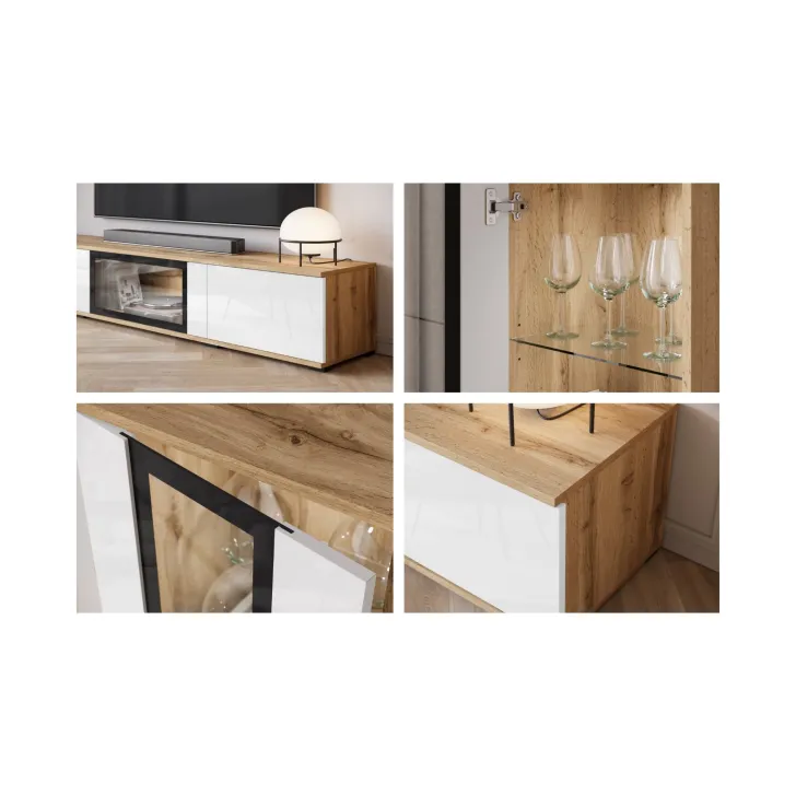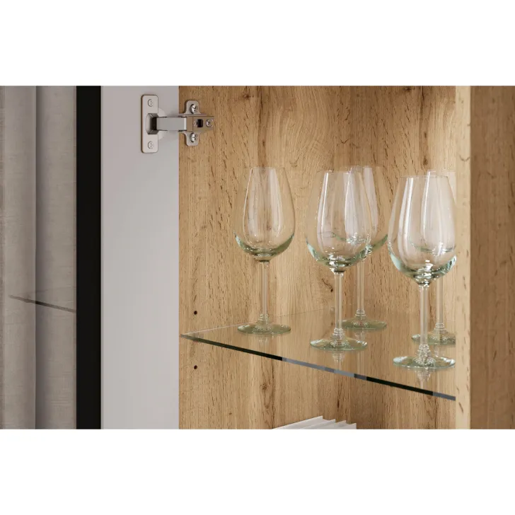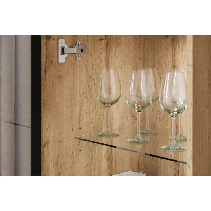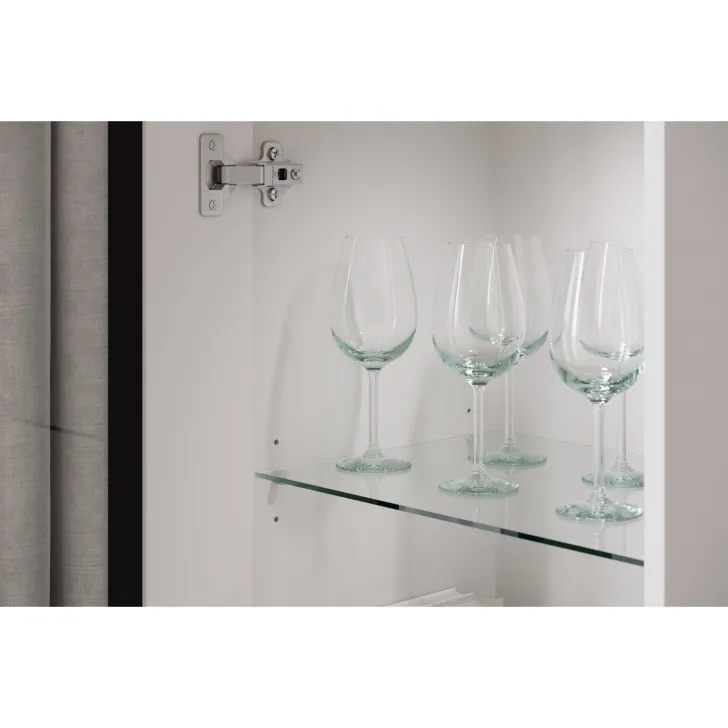 - Sicherheit und Eleganz – die Türen mit Verglasung in den Vitrinen und der mittleren Klappe des TV-Schranks sind aus gehärtetem Glas, und die Regale bestehen aus 4 mm dickem Klarglas.