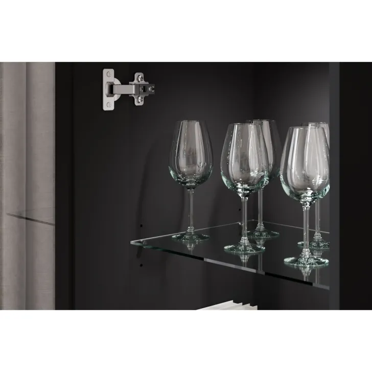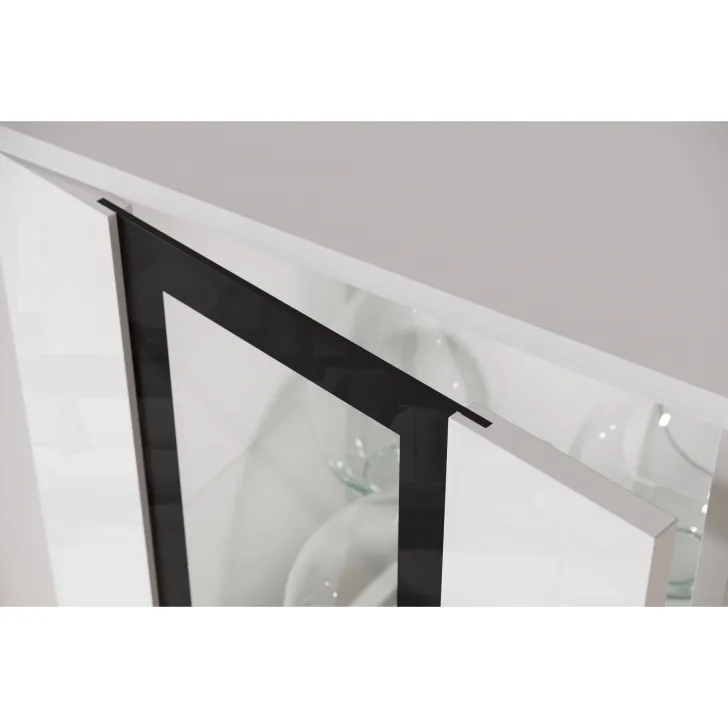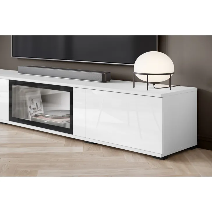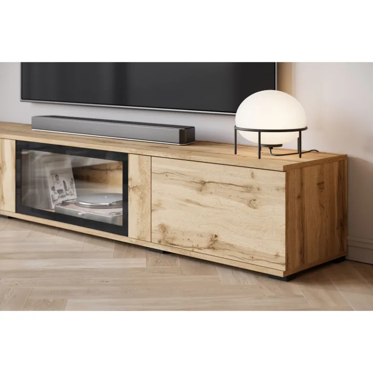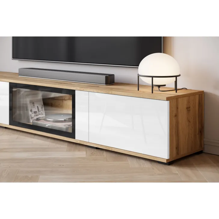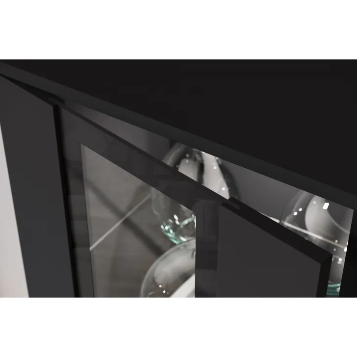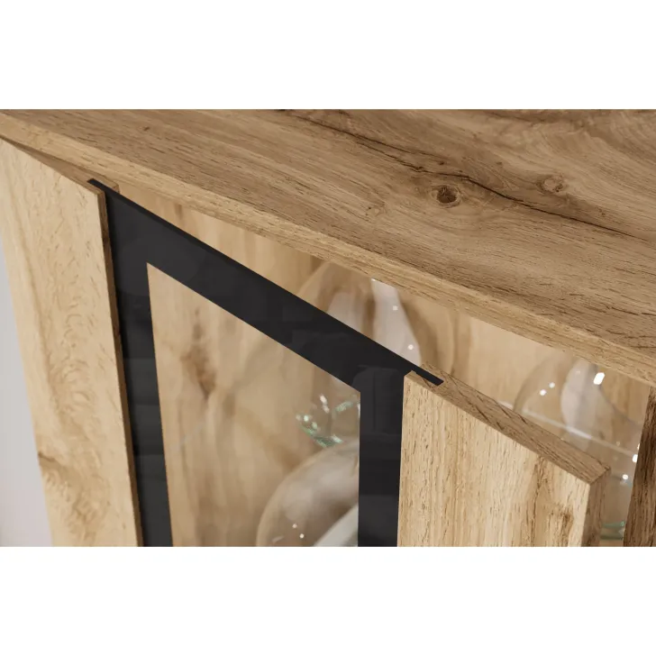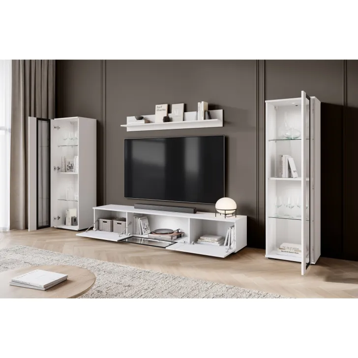 - Sicherheit und Eleganz – die Türen mit Verglasung in den Vitrinen und der mittleren Klappe des TV-Schranks sind aus gehärtetem Glas, und die Regale bestehen aus 4 mm dickem Klarglas.