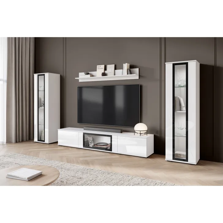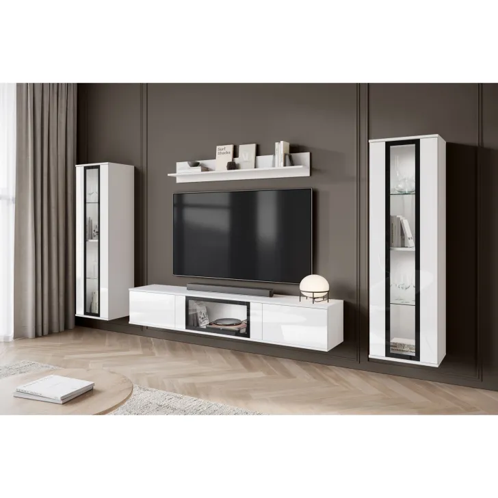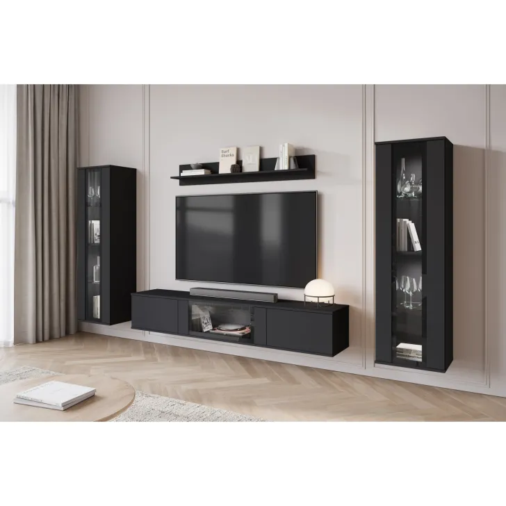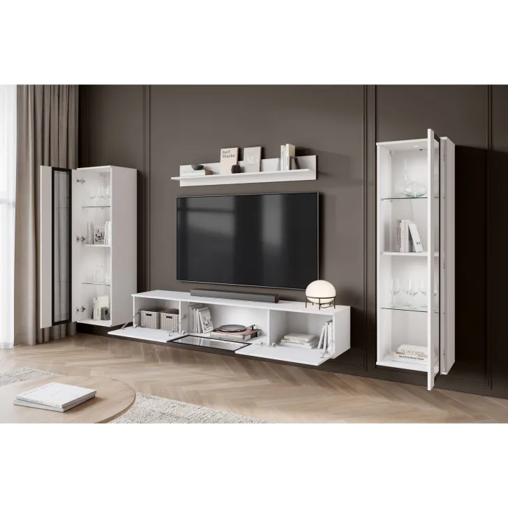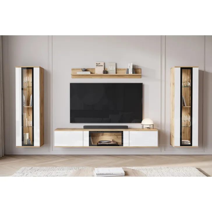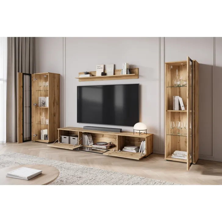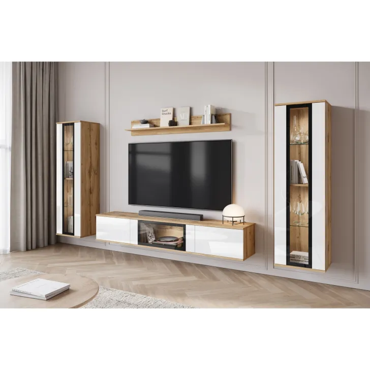 - Ästhetik und Haltbarkeit – sichtbare Kanten und Fronten sind mit 0,5 mm dickem ABS-Kantenband versehen, was das hervorragende Aussehen der Wohnwand betont.