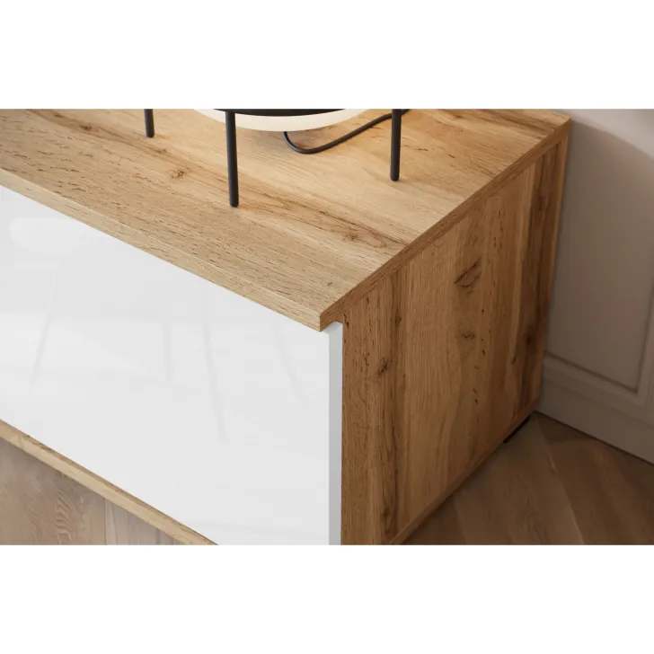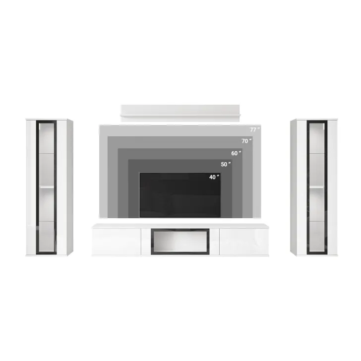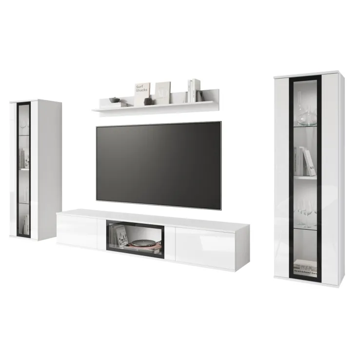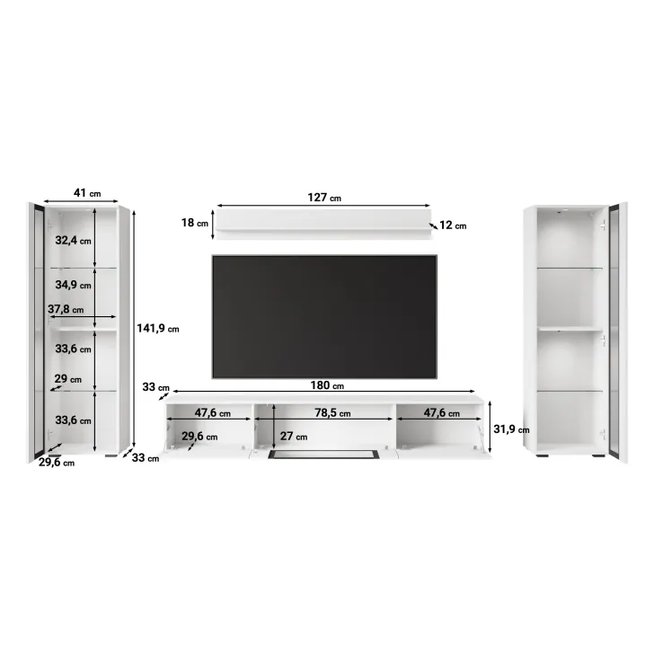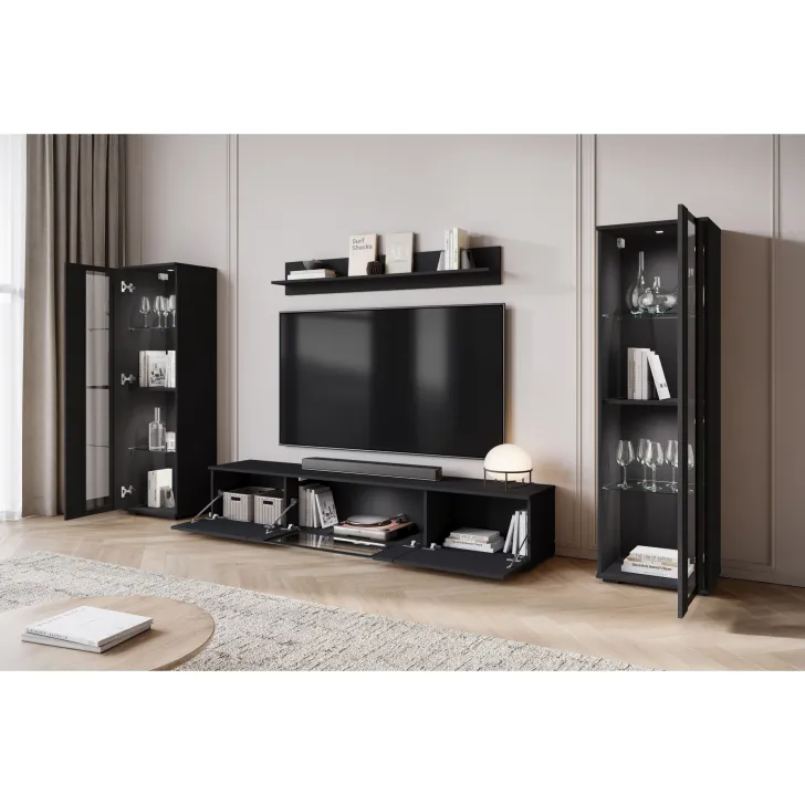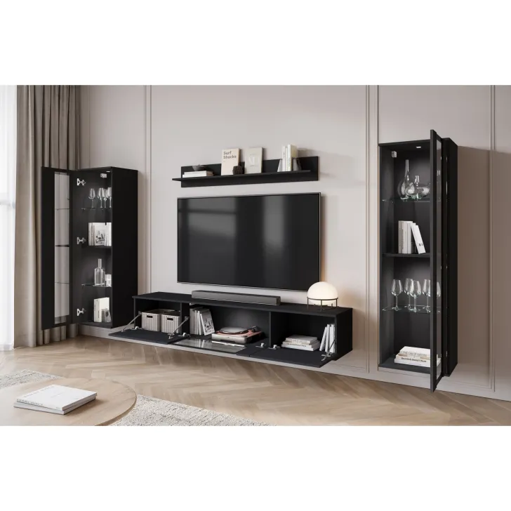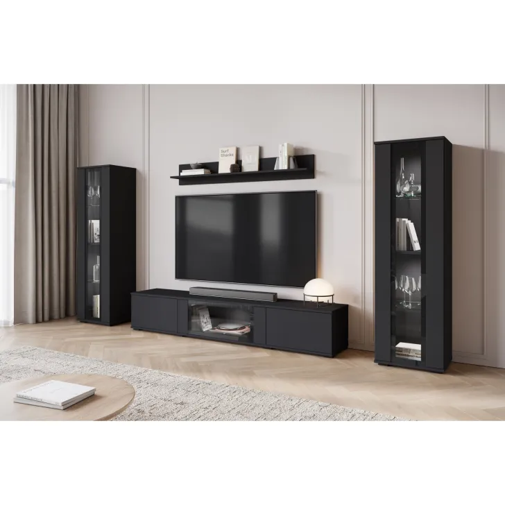 - Ästhetik und Haltbarkeit – sichtbare Kanten und Fronten sind mit 0,5 mm dickem ABS-Kantenband versehen, was das hervorragende Aussehen der Wohnwand betont.