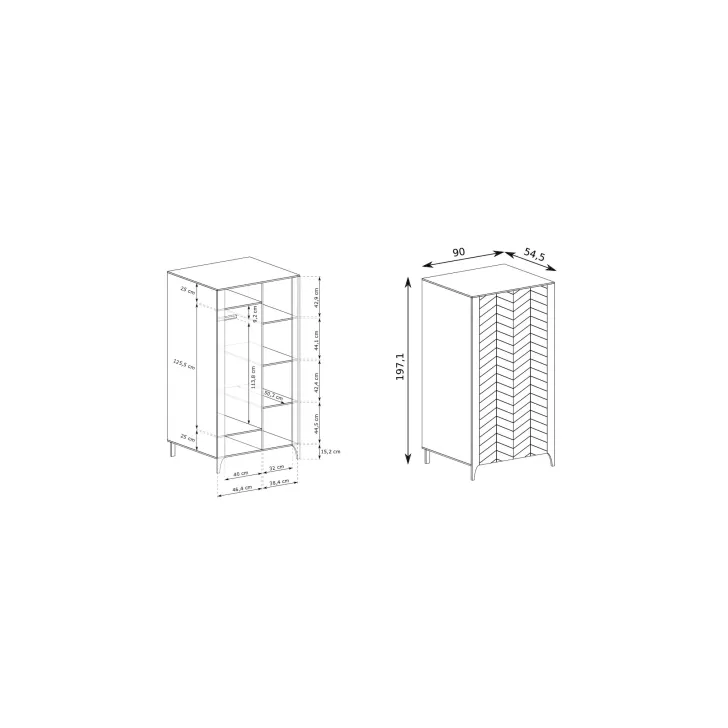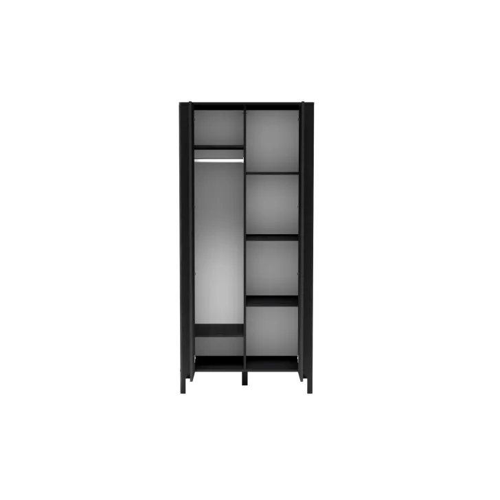 - Funktionalität – hinter den zwei Türen verbergen sich Regalböden und eine Kleiderstange, ideal zur Aufbewahrung von Kleidung, Taschen oder Schuhen.