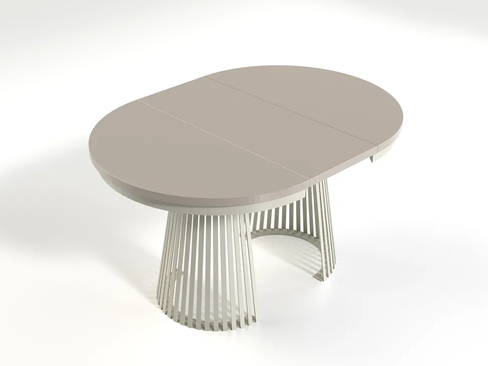 Besondere Konstruktion und Design: Das Tischbein ist ein kunstvoll gestaltetes Metallwerk – stabil und ausgesprochen modern, zieht es die Blicke aller Besucher auf sich. Seine skulpturale Form erinnert an einen Fächer oder eine ausladende geometrische Figur. So wirkt der Tisch leicht und dennoch robust in seiner Konstruktion.