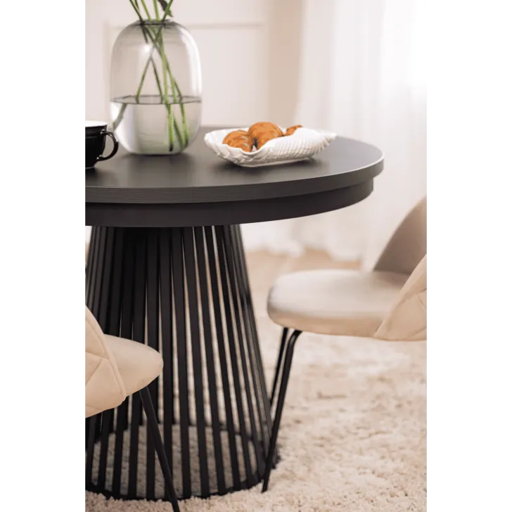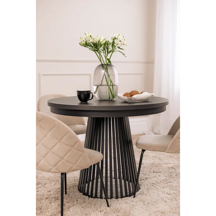 Der GORI Tisch vereint elegantes Design mit alltäglicher Funktionalität. Er ist die perfekte Ergänzung für jedes Wohnzimmer oder Esszimmer und bildet deren stilvolles Herzstück. Die charakteristische, runde Tischplatte auf einem originellen Metallgestell bildet ein harmonisches Element, das ins Auge fällt und sich sowohl in moderne als auch klassische Innenräume hervorragend einfügt.