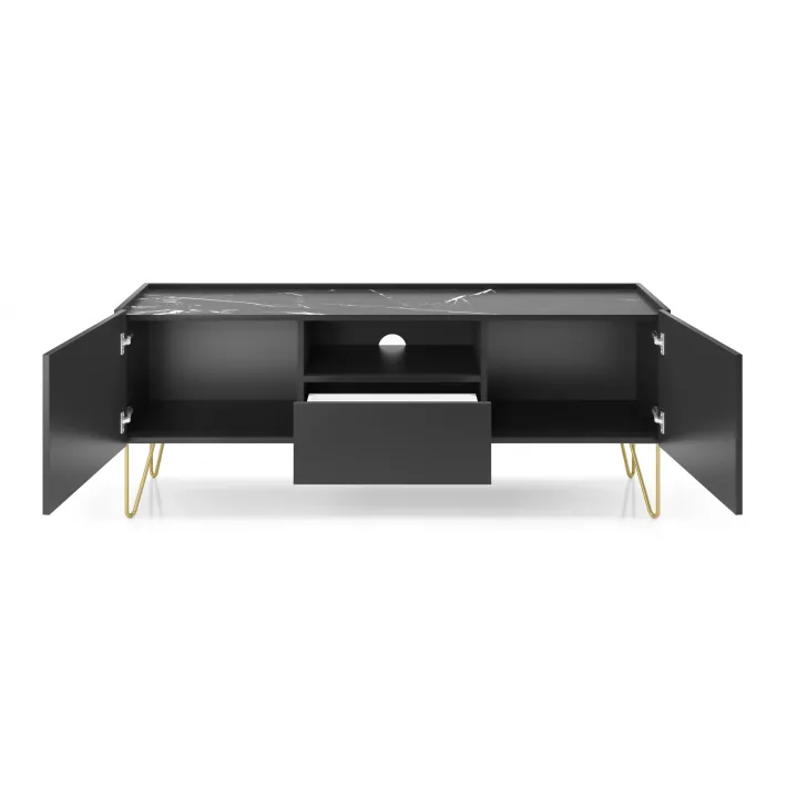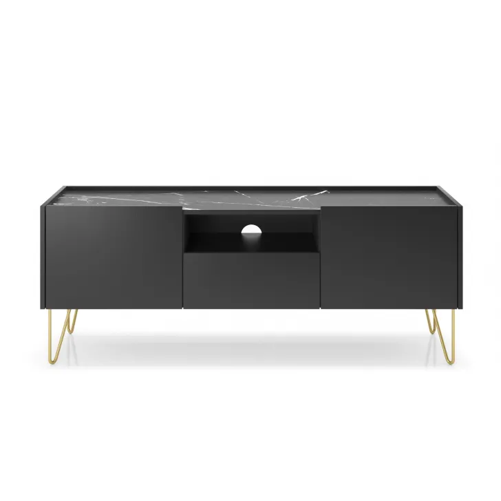 Sparen Sie Platz und sorgen Sie für Ordnung mit einer praktischen Schublade, die sich direkt unter dem offenen Fach befindet – ideal für Receiver, Spielkonsolen oder Fernbedienungen. Hinter den eleganten Türen finden Sie zusätzlichen Stauraum für Alltagsgegenstände. Robuste Metallfüße unterstreichen den raffinierten Charakter dieses Möbels und verleihen ihm Stabilität und Langlebigkeit. Der TV-Schrank HAGA ist aus hochwertigen Materialien gefertigt, die für seine lange Lebensdauer garantieren.
