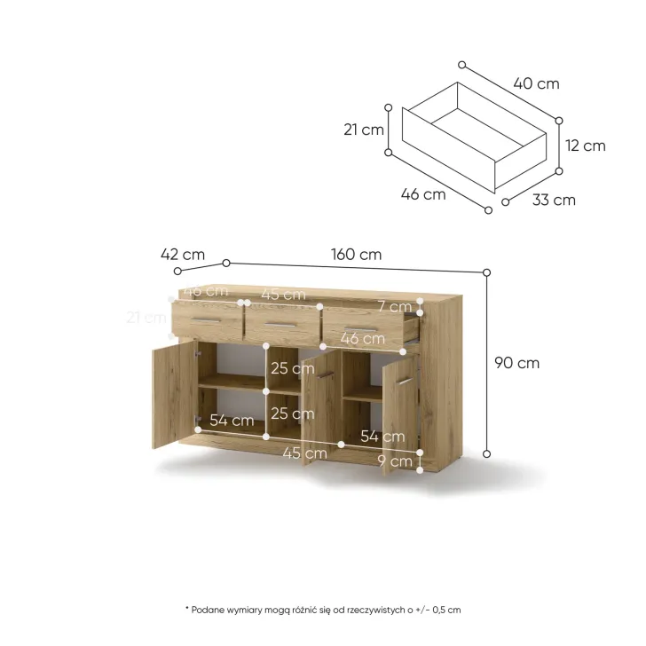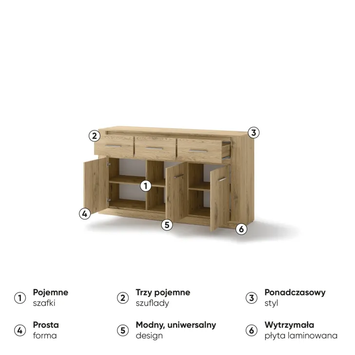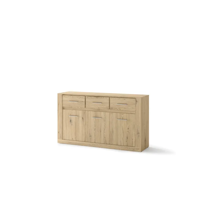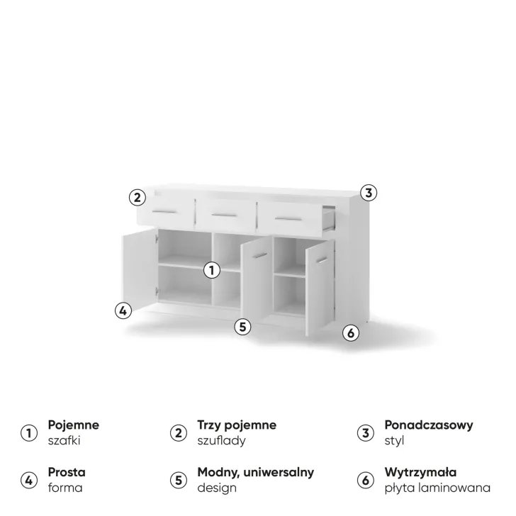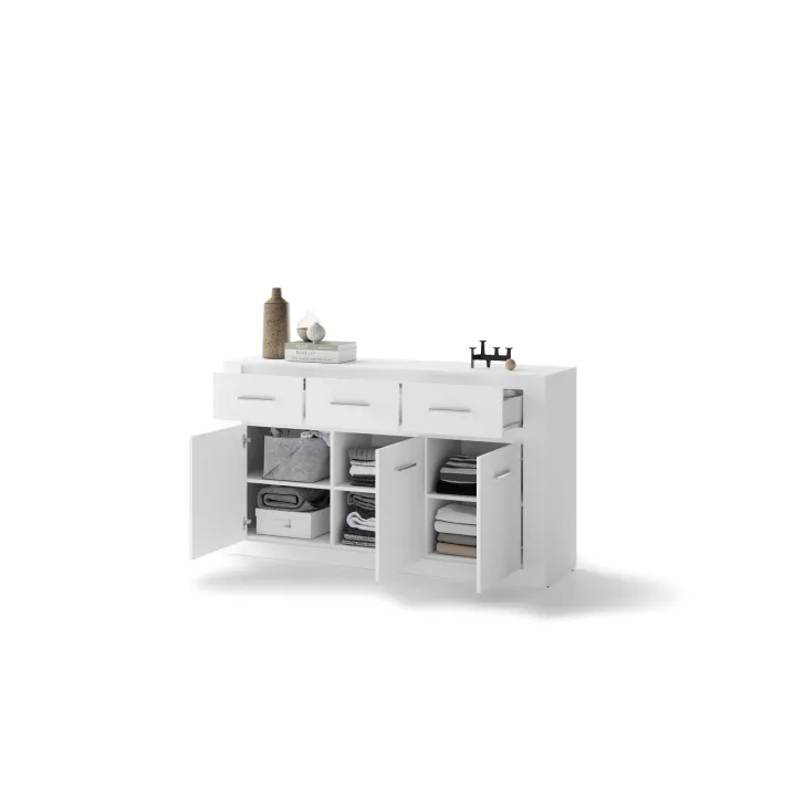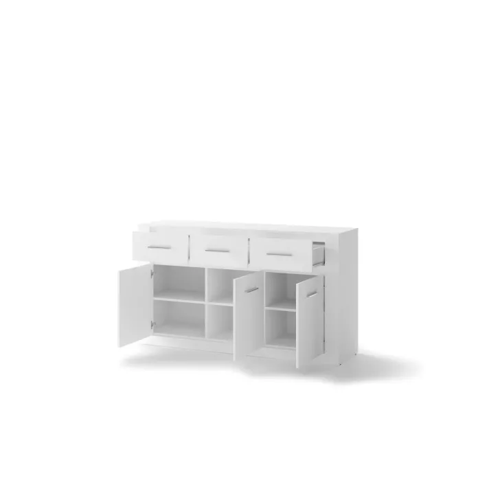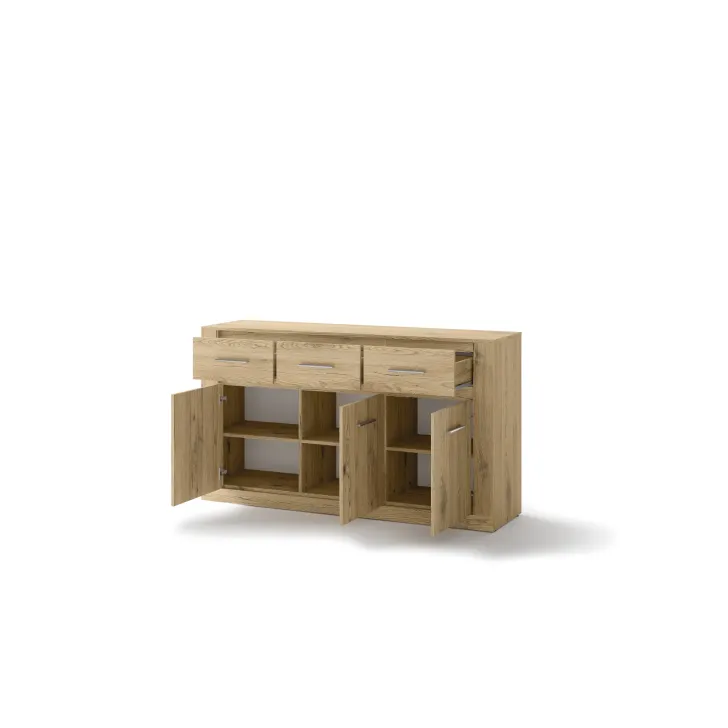Sie ist mit drei geräumigen Schubladen und einer Tür ausgestattet, hinter der sich zusätzliche Einlegeböden verbergen. Dank ihres universellen Designs passt sie in jedes Zimmer – ob Wohnzimmer, Essbereich, Schlafzimmer oder Salon. Ein echtes Must-have für alle, die Funktionalität mit innovativem Stil verbinden möchten.