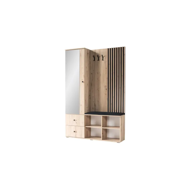 Die Garderobe "MALI" ist der neueste Hit in der Möbelwelt – eine perfekte Verbindung aus Loft-Stil und Funktionalität. Sie passt ideal in moderne Räume und verleiht ihnen einen einzigartigen Charakter. Die Garderobe ist in der trendigen Farbe Artisan Eiche gehalten und wird durch elegante schwarze Akzente ergänzt, die ihr ein stilvolles Aussehen verleihen.