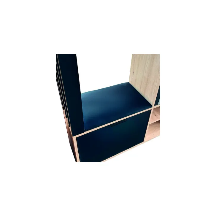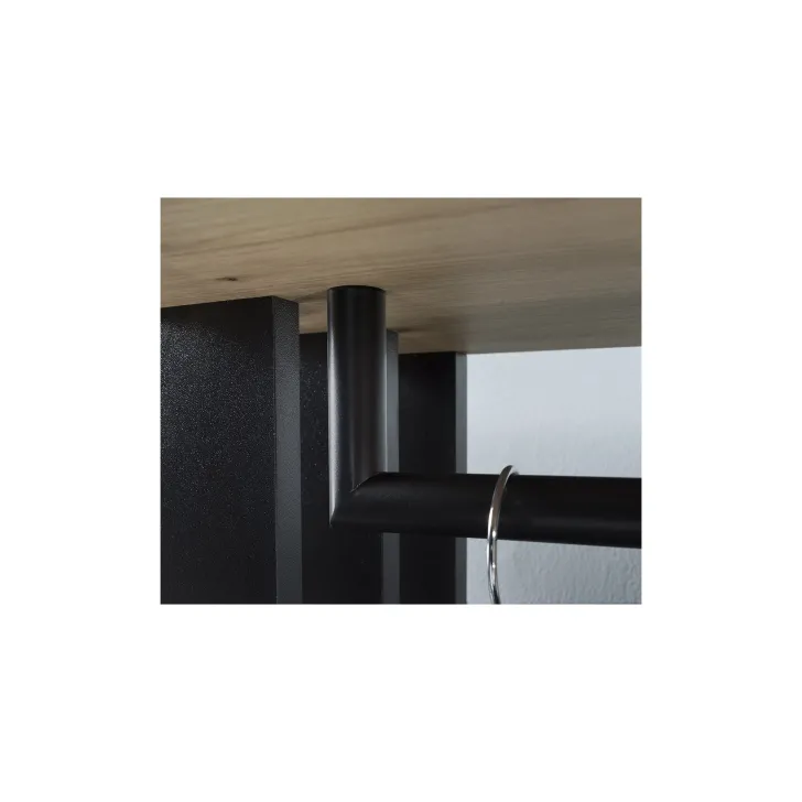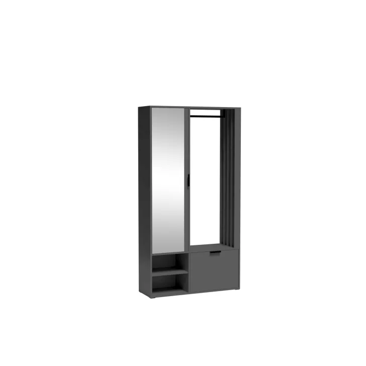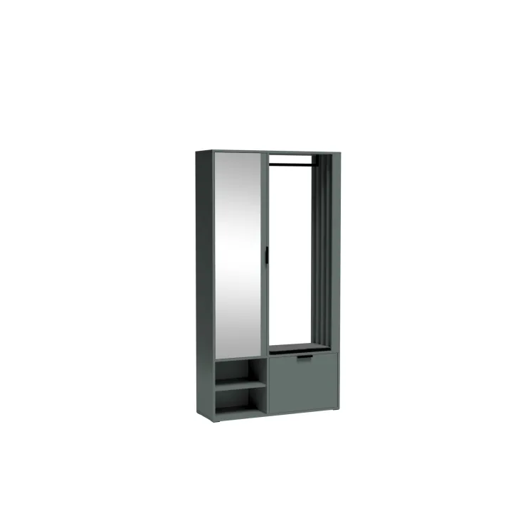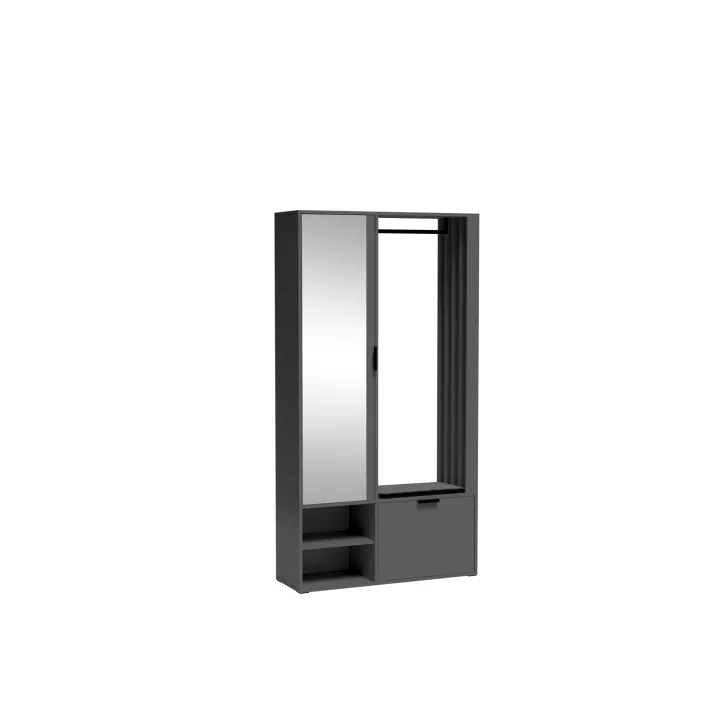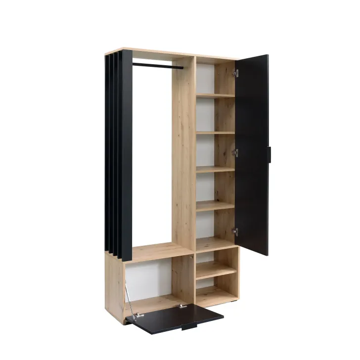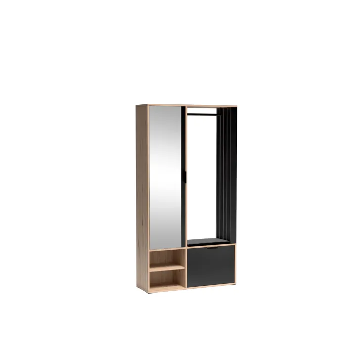 Das Set besteht aus: vier geräumigen Einlegeböden hinter einer großen Spiegeltür, einem Schuhschrank mit Klappe, einer robusten Metall-Kleiderstange, einem optionalen, hochwertigen, gepolsterten Sitz in Schwarz sowie offenen Fächern mit zusätzlichem Regalboden.