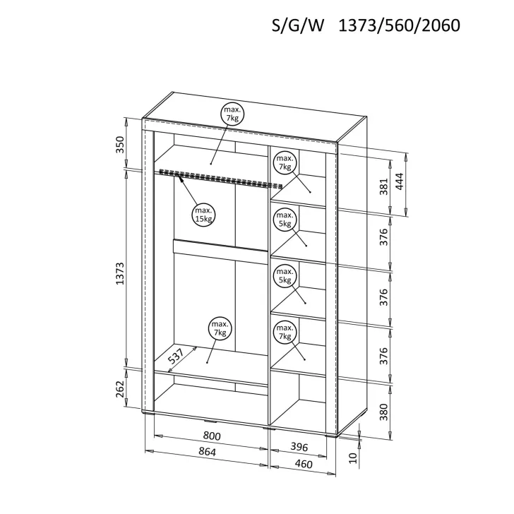 Die moderne und geräumige Konstruktion ermöglicht es, alles, was Sie vor neugierigen Blicken verbergen möchten, ordentlich zu verstauen. Ausgestattet mit einer Metallkleiderstange (maximale Belastung bis 15 kg) und Regalen hinter den Türen bietet sie großzügigen Stauraum.