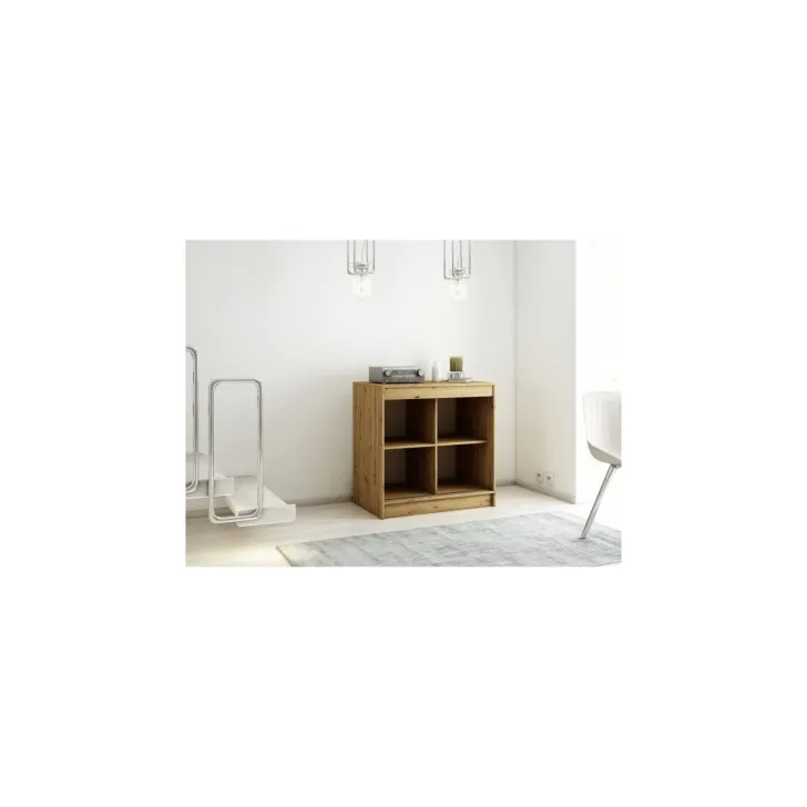 Die Kommode "LAMELLO" vereint Funktionalität mit außergewöhnlichem Stil. Sie zeichnet sich durch eine solide Verarbeitung aus – für ihre Herstellung wurde eine hochwertige laminierte Platte verwendet, die dem Möbelstück jahrelange Haltbarkeit verleiht. Zusätzlich sind die Kanten mit ABS-Kantenumleimung versehen, was die Widerstandsfähigkeit erhöht und für sichere Nutzung sorgt.