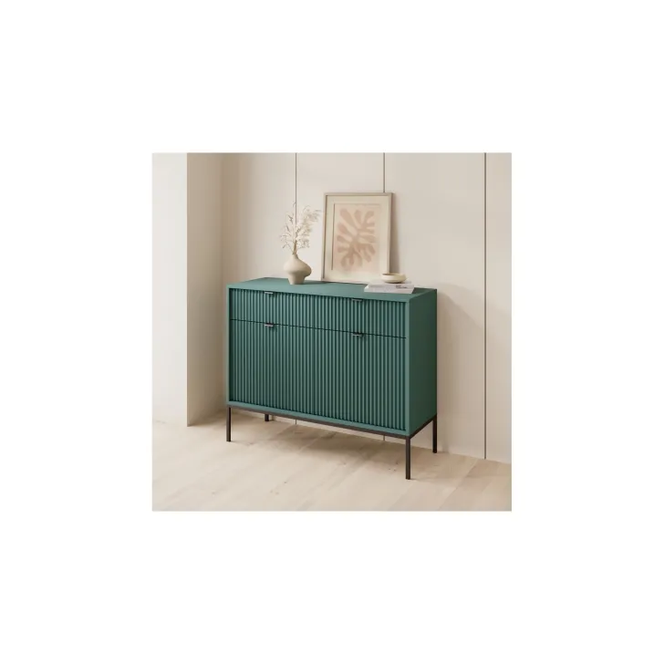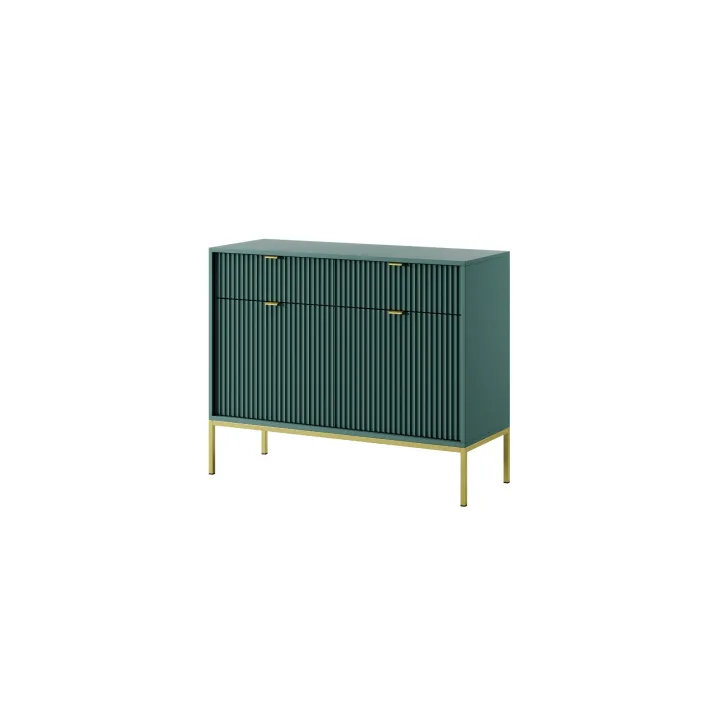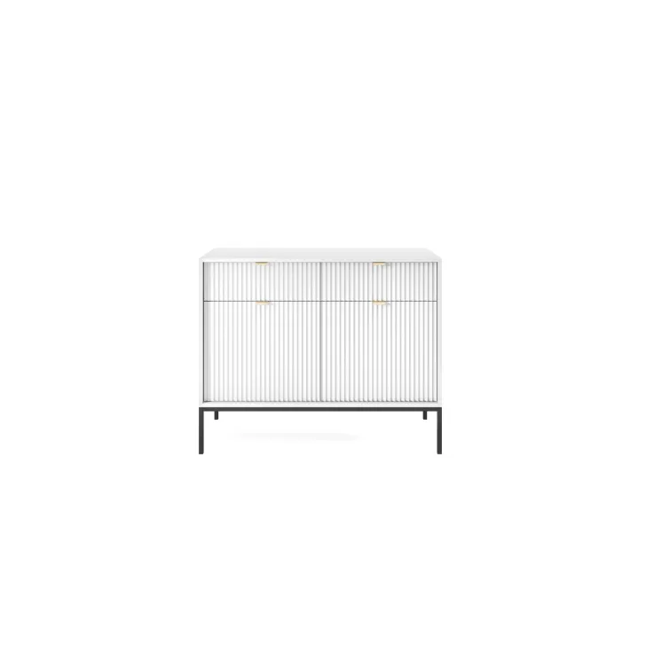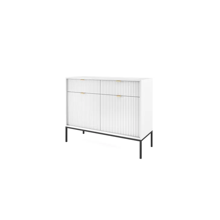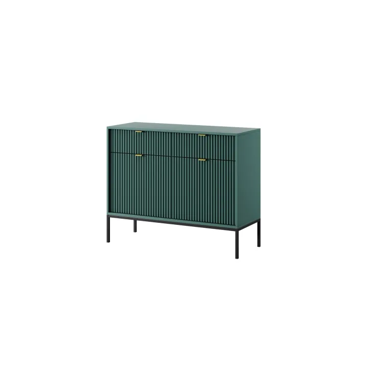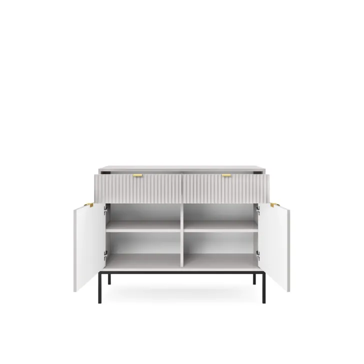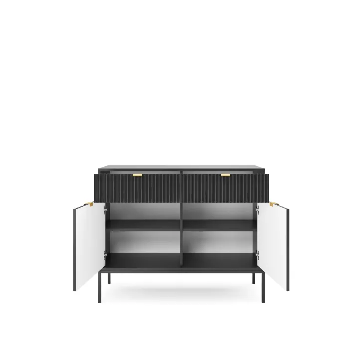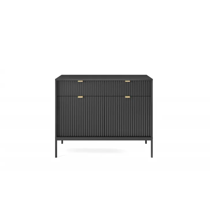 Die Kommode „NOVA“ wurde mit Blick auf höchste Ansprüche an Langlebigkeit und Ästhetik entwickelt. Die Herstellung aus robuster, laminierter Platte sorgt für eine besonders kratzfeste und widerstandsfähige Oberfläche. Zusätzlich sind die seitlichen Kanten mit ABS-Kantenband versehen, was eine langfristige Nutzung ohne sichtbare Gebrauchsspuren garantiert. Die stabilen Metallbeine verleihen der Kommode moderne Eleganz und sichern zugleich festen Stand.
