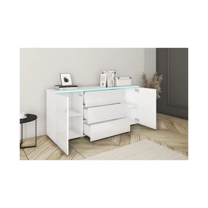 - Drei geräumige Schubladen und zwei Einlegeböden hinter Türen – bieten viel Stauraum für verschiedene Gegenstände und erleichtern die Organisation des Raumes.