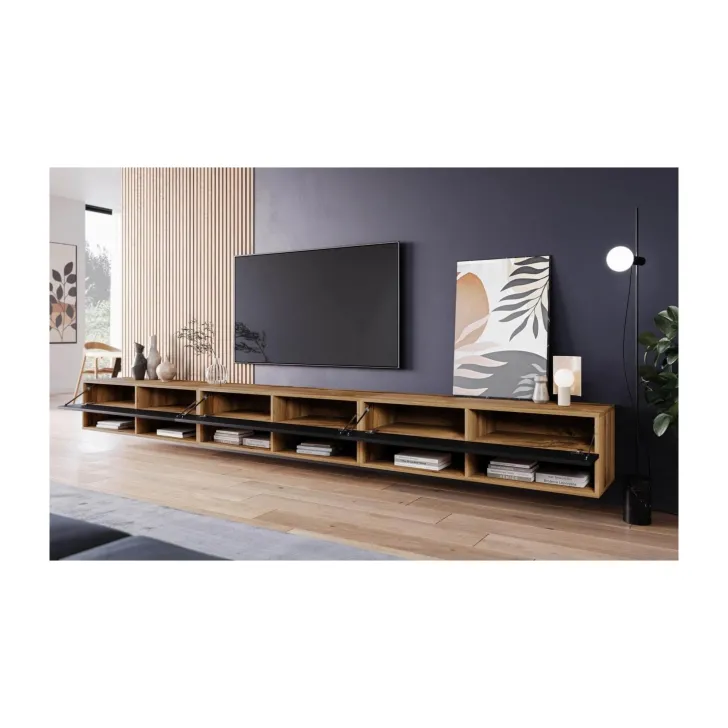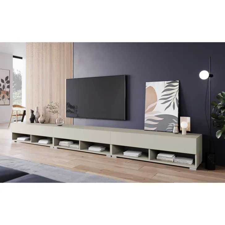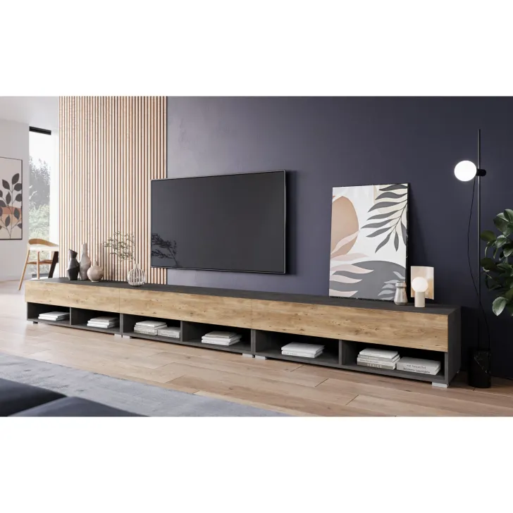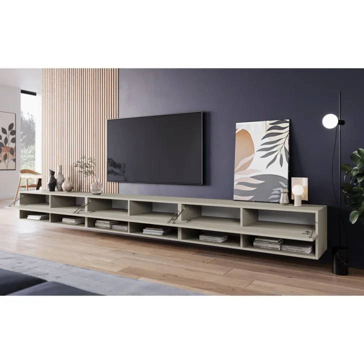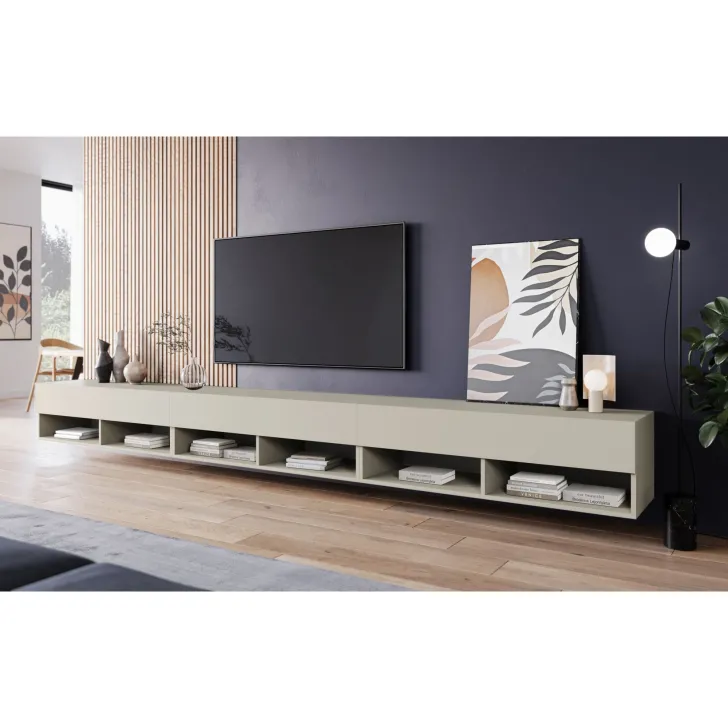 Ein weiterer großer Vorteil des TV-Schranks „ANNE“ ist seine Vielseitigkeit. Er kann auf den im Set enthaltenen silbernen Füßen stehen oder nach Belieben an der Wand montiert werden. Drei separate Module mit jeweils 100 cm Breite ergeben zusammen ein beeindruckendes Gesamtmaß von 3 Metern. Damit ist dieser Schrank ein wahres Paradies für alle Liebhaber von Audio- und Videosystemen.