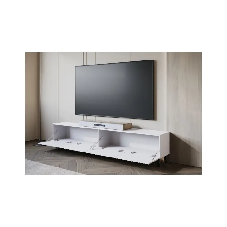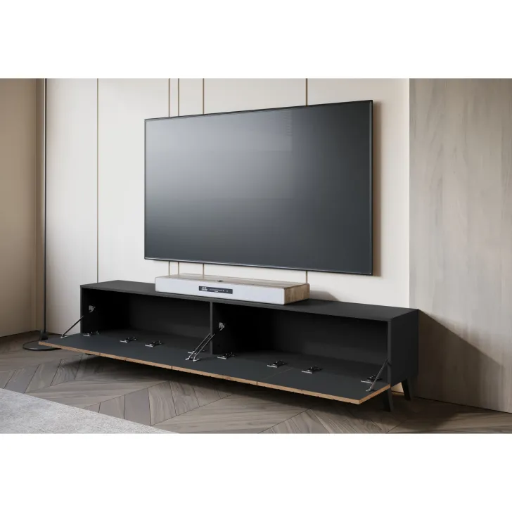 Unser TV-Lowboard zieht die Blicke mit seinem zeitgemäßen Stil auf sich. Die eleganten, gefrästen Fronten sorgen für einen besonderen Charakter im Raum. Trotz ihrer Länge bleibt die Schrankkonstruktion dank der hohen Beine stabil und wirkt zugleich leicht und luftig.