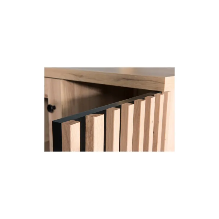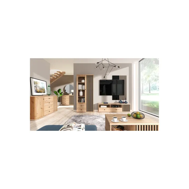 Das Platzieren der Kommode "MALI" aus Artisan-Eiche in Ihrem Wohnzimmer oder Schlafzimmer ist eine hervorragende Möglichkeit, Modernität und Funktionalität in Ihre Einrichtung zu bringen. Diese außergewöhnliche Kommode, inspiriert von den neuesten Möbeltrends, verbindet komfortable Nutzung mit elegantem Design. Besonders auffällig sind die Lamellen in Form von Leisten, die an der Front angebracht sind und dem Möbelstück einen einzigartigen Charakter verleihen.