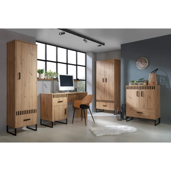 Die Szafa MELLE 1 steht auf stilvoll gestalteten Metallfüßen, die dem Möbelstück optische Leichtigkeit verleihen. Das klare, aber ausdrucksstarke Design in Artisan-Eiche wird durch schwarze Metallbeine und -griffe ergänzt – eine Hommage an den beliebten Industrial- und Loftstil.