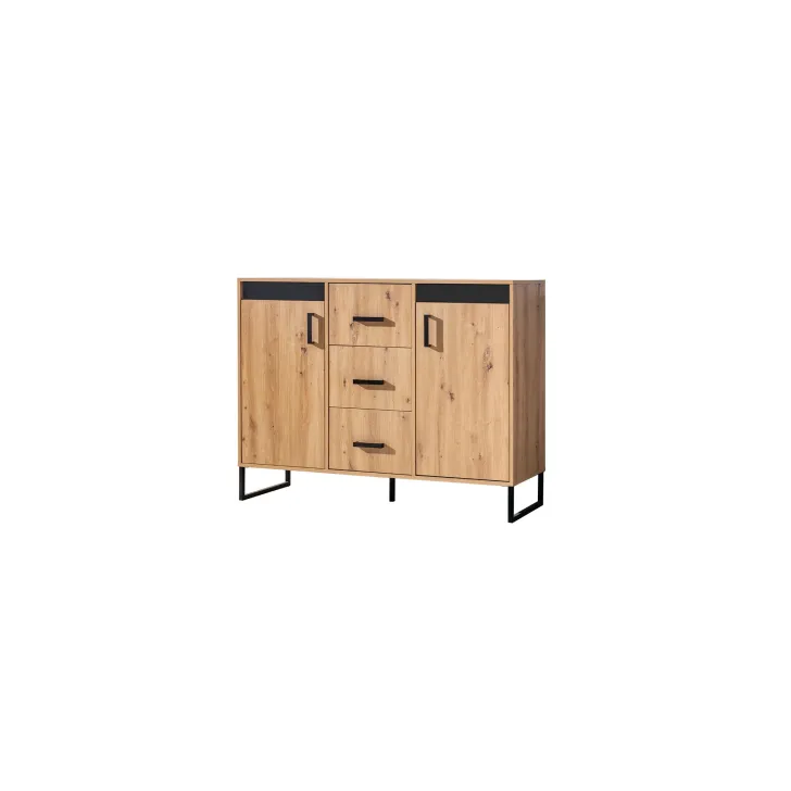 Der minimalistische Stil wird durch schwarze Metallfüße und -griffe ergänzt, die einen eleganten Kontrast zur Farbgebung in Artisan Eiche bilden und den industriellen Charakter des Möbels unterstreichen.