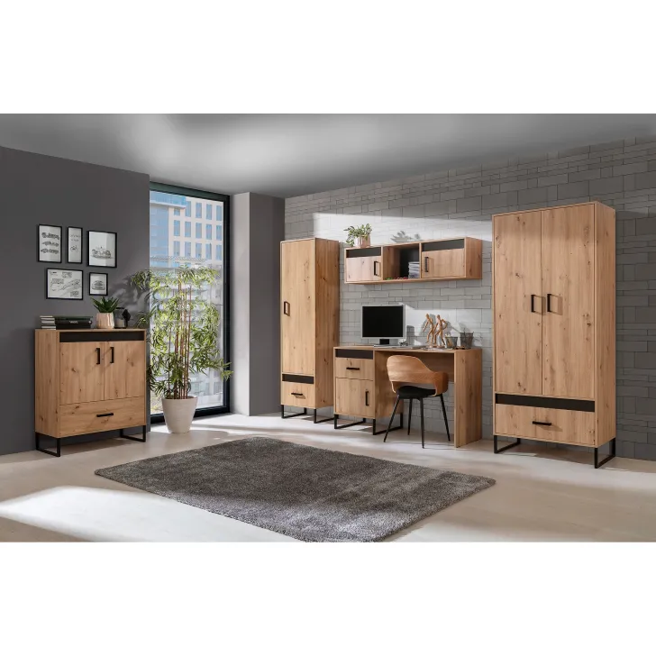 Der durchdachte Look des MELLE 9 wird durch schwarze Metallelemente – Beine und Griffe – abgerundet. Sie verleihen ihm einen klaren, loftartigen Stil. Das Finish in Artisan-Eiche bringt zudem einen Hauch Eleganz und Wärme in dein Interieur.