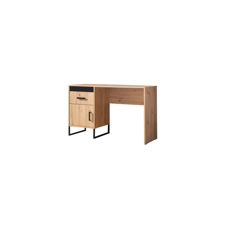 Der Schreibtisch verfügt über eine Schublade mit kugelgelagerten Führungsschienen, die ein besonders sanftes Öffnen ermöglichen und einen einfachen Zugriff auf verstauten Inhalt garantieren. Unter der Schublade befindet sich eine Tür, hinter der sich zusätzlicher Stauraum verbirgt.