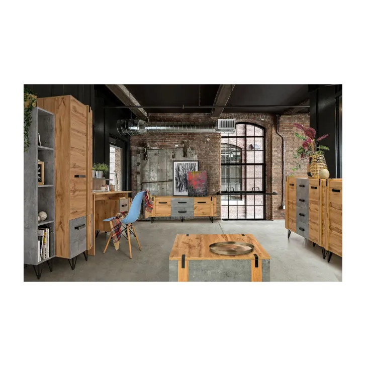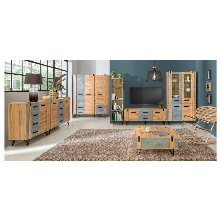 Unter den vielen Möbelstücken, die man für das Wohnzimmer wählen kann, zeichnet sich der TV-Schrank Milenium 135 cm Eiche Wotan / Beton Millenium sowohl durch seine Funktionalität als auch durch sein Design aus. Dieses elegante Möbelstück ist nicht nur der ideale Platz für den Fernseher, sondern hilft dank seiner durchdachten Aufteilung mit zwei geräumigen Schubladen und zwei Türen auch dabei, Ordnung zu halten. Jedes Detail dieses Schranks wurde mit höchster Präzision gefertigt – die sorgfältige Verarbeitung ist in jedem Element sichtbar. Die hochwertige laminierte Platte, aus der der Schrank hergestellt wurde, garantiert Langlebigkeit und Robustheit. Die Kanten sind mit ABS-Kantenband versehen, das kratz- und stoßfest ist und somit den makellosen Look des Möbels über viele Jahre hinweg erhält. Ein weiteres Highlight sind die Metallbeine, die dem Schrank einen modernen, industriellen Charakter verleihen. Dieses Designelement sorgt nicht nur für Stil, sondern auch für zusätzliche Stabilität und Haltbarkeit.