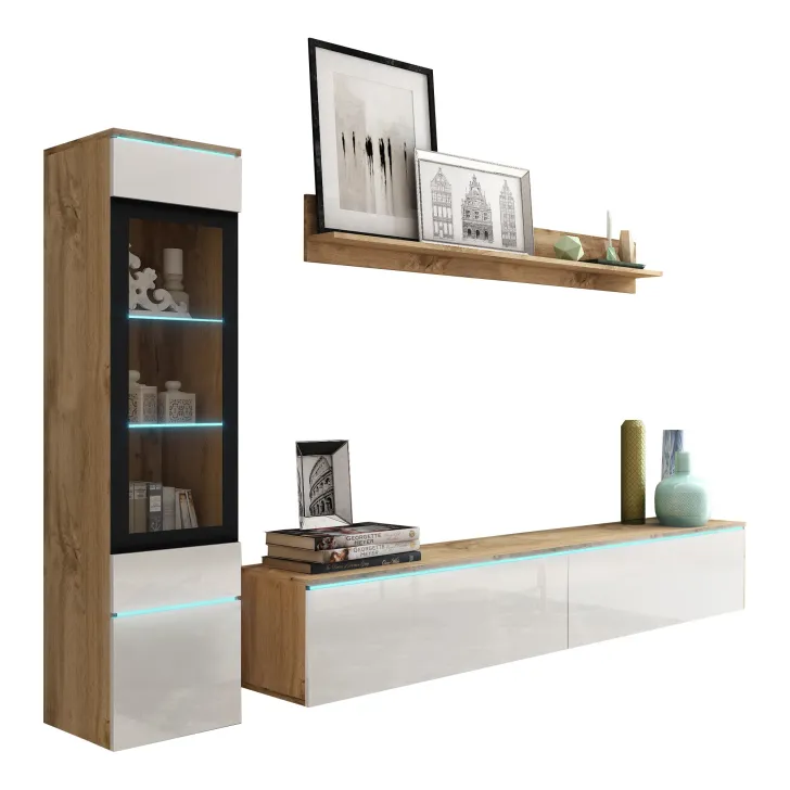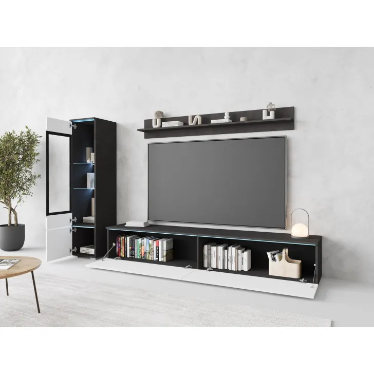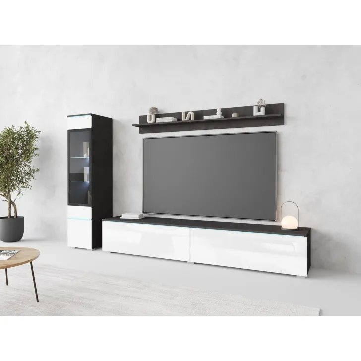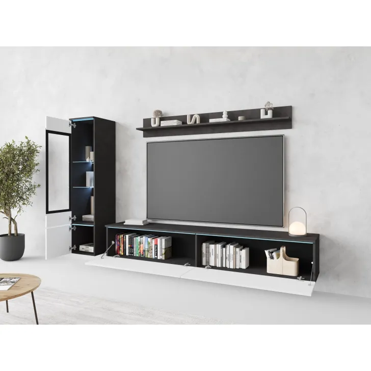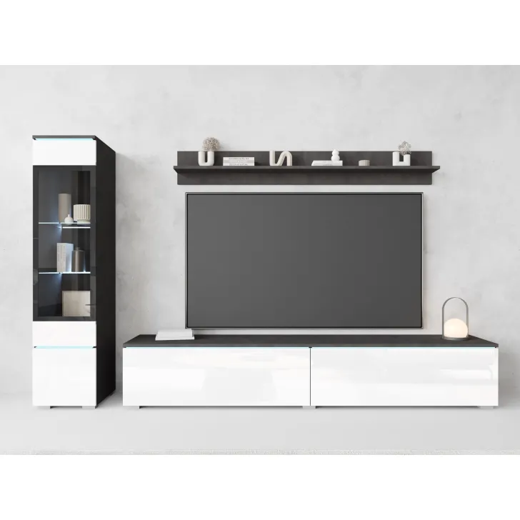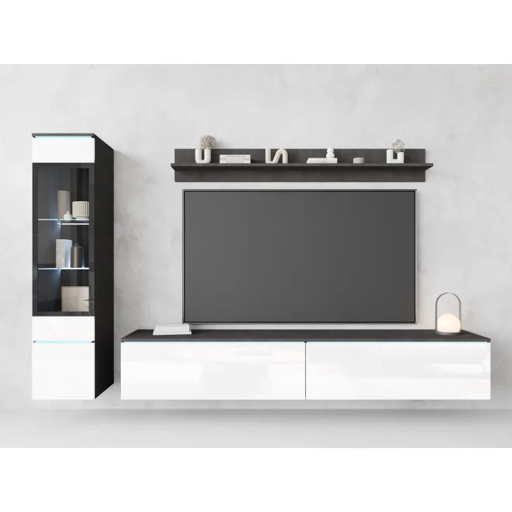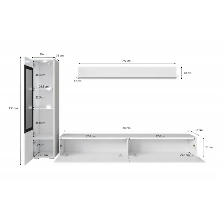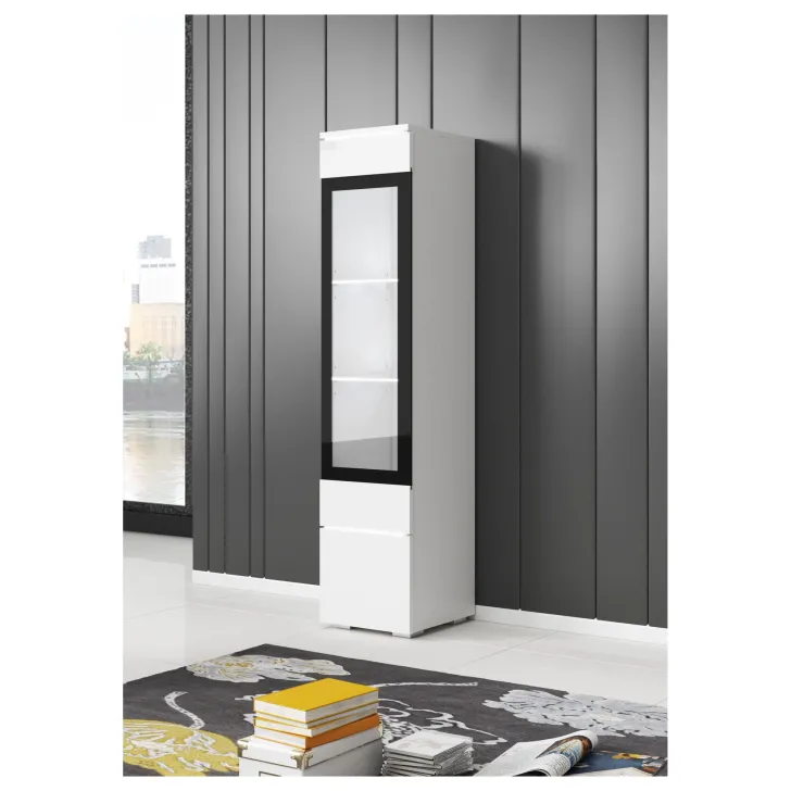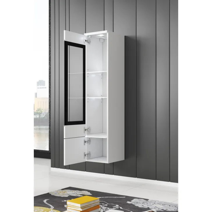 Die Fronten des Möbels bestehen aus Polygloss-Platten und teilweise lackiertem, gehärtetem Glas und stellen wunderschöne dekorative Elemente dar, die dem Regal Tiefe und Stil verleihen. Die Flexibilität der Montage ermöglicht es, das Möbelstück an der Wand zu befestigen oder auf den Boden zu stellen. Eine optionale LED-Beleuchtung wird das Design des Möbels betonen und eine gemütliche Atmosphäre im Raum schaffen.