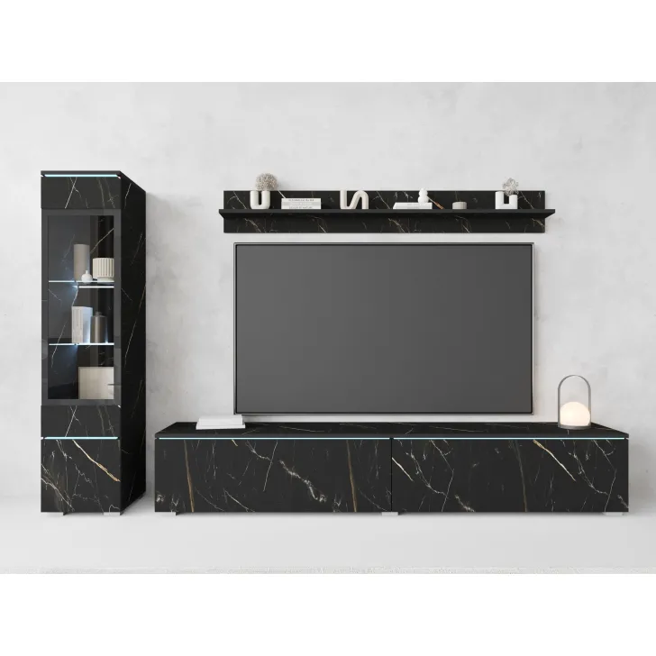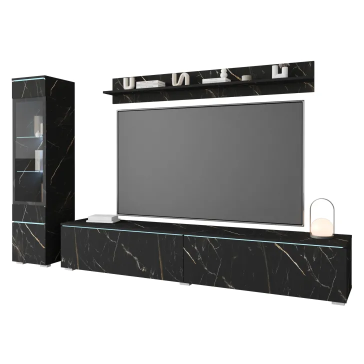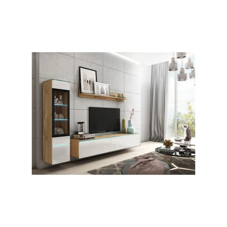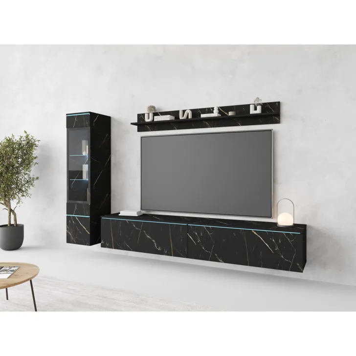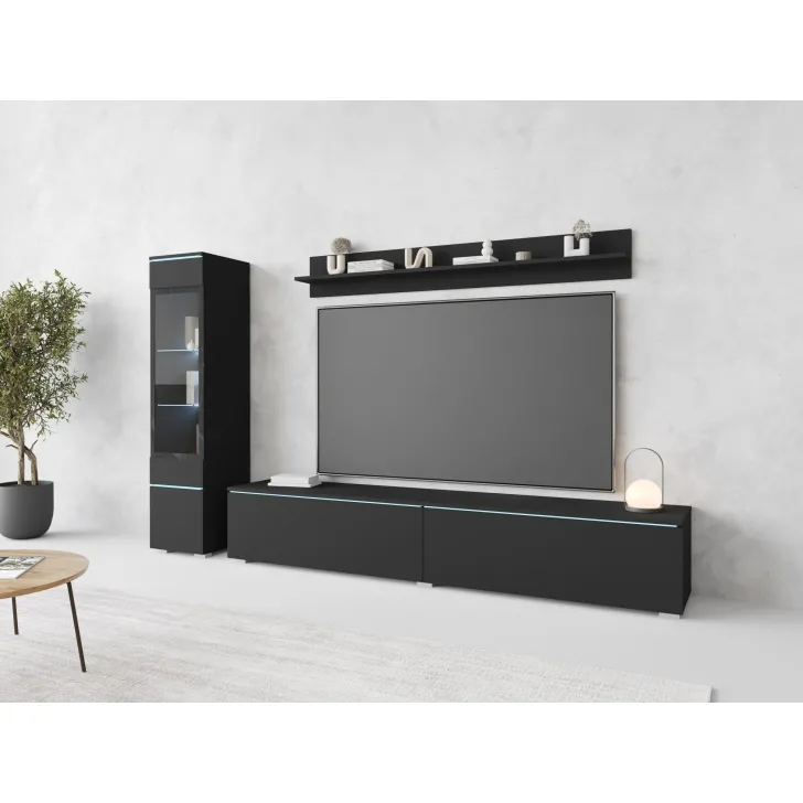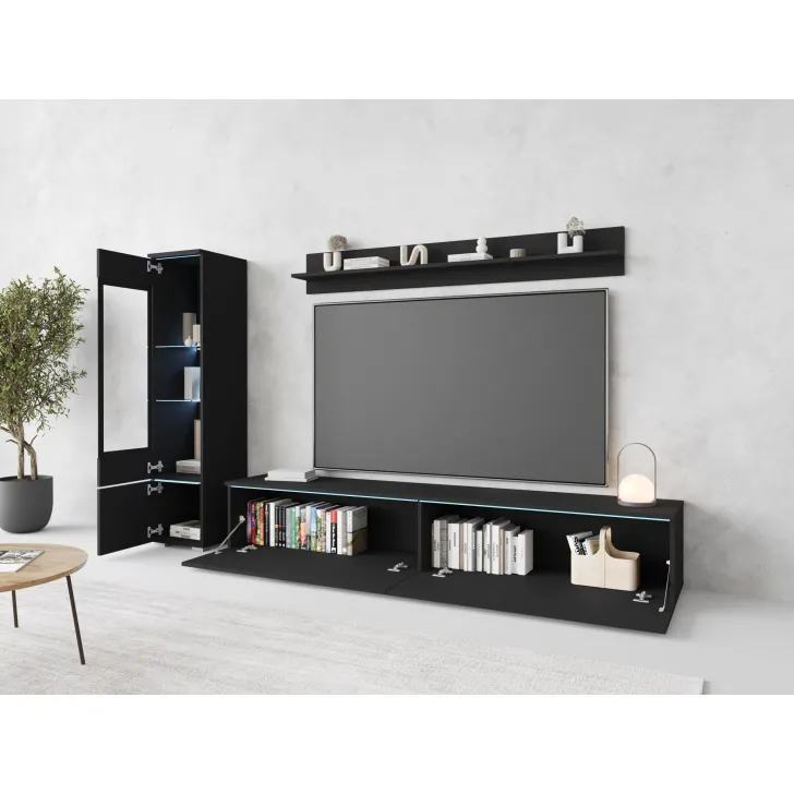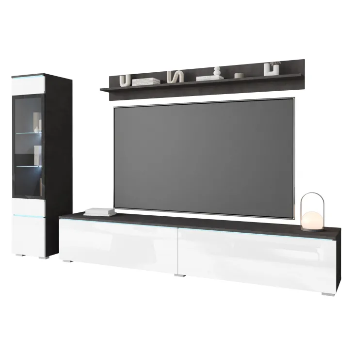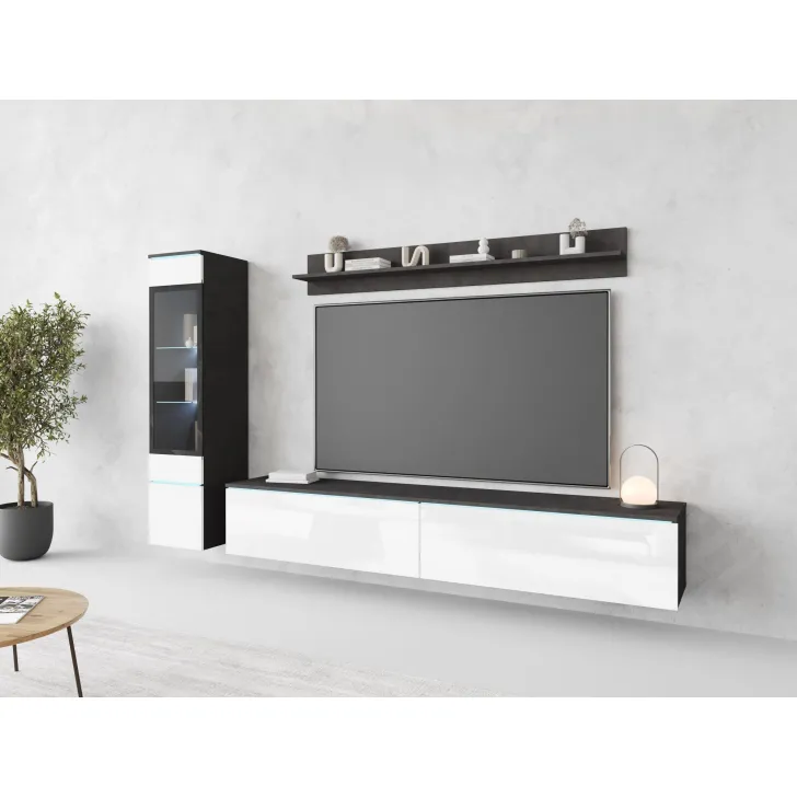 Die Fronten des Möbels bestehen aus Polygloss-Platten und teilweise lackiertem, gehärtetem Glas und stellen wunderschöne dekorative Elemente dar, die dem Regal Tiefe und Stil verleihen. Die Flexibilität der Montage ermöglicht es, das Möbelstück an der Wand zu befestigen oder auf den Boden zu stellen. Eine optionale LED-Beleuchtung wird das Design des Möbels betonen und eine gemütliche Atmosphäre im Raum schaffen.