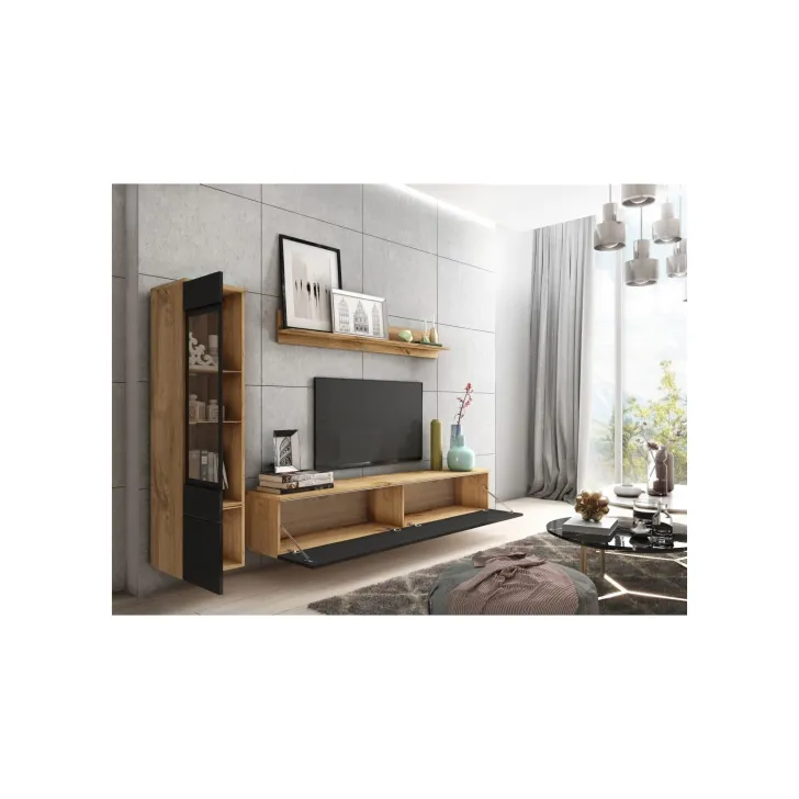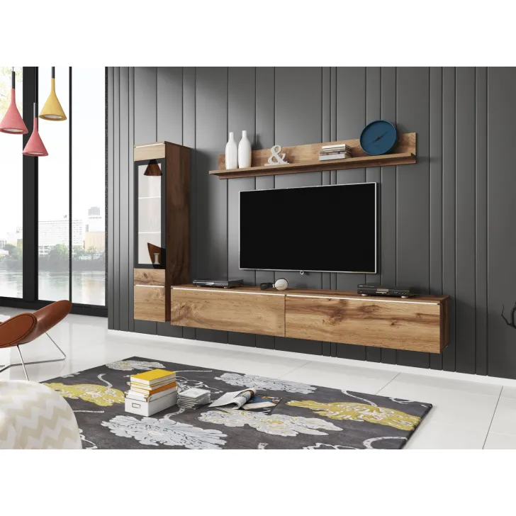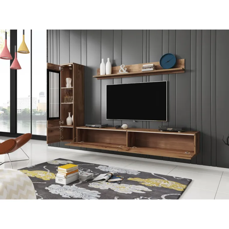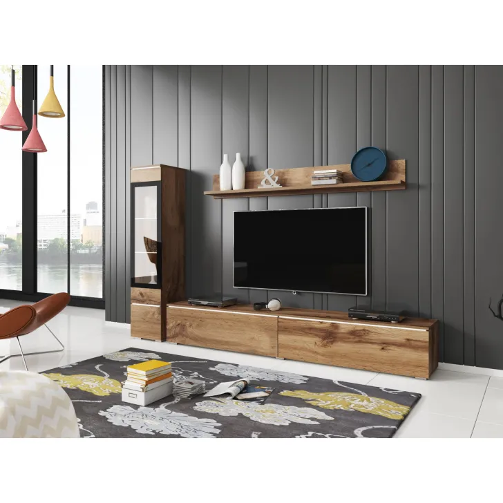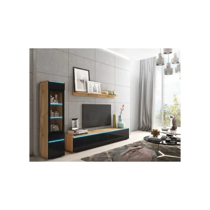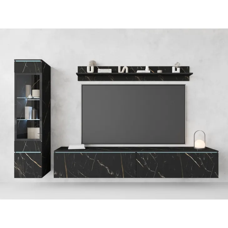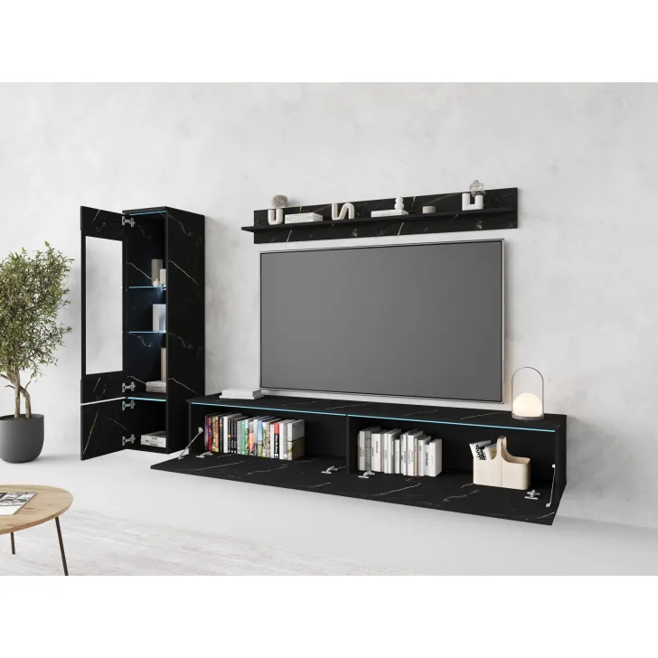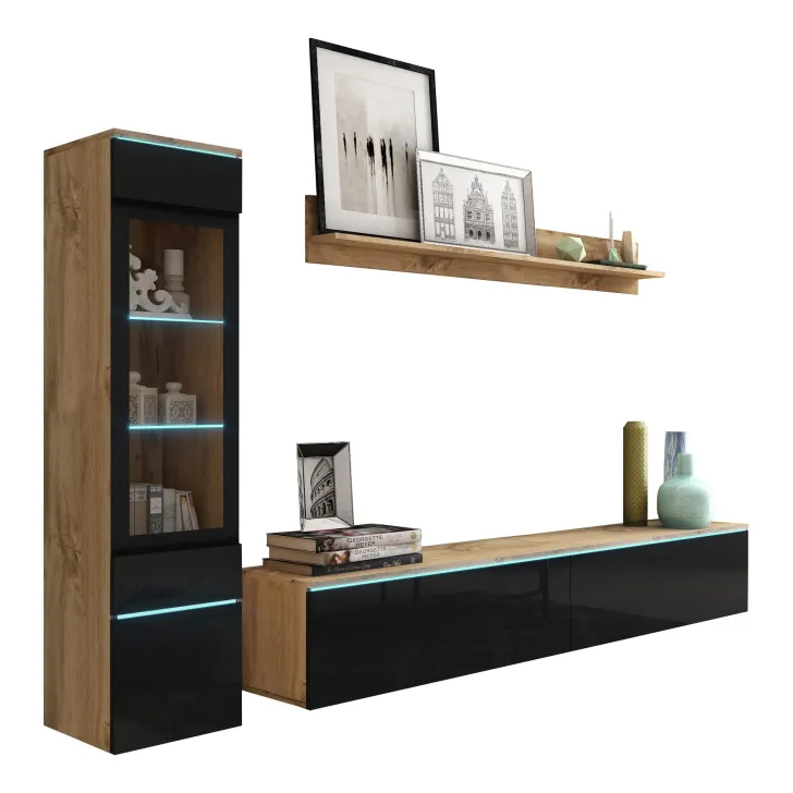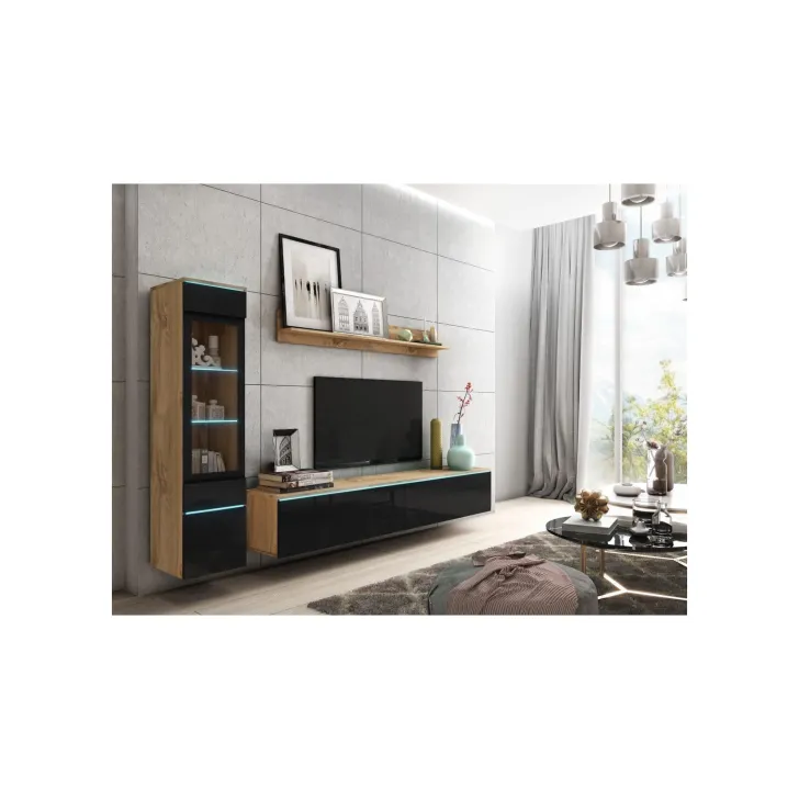 Die Fronten des Möbels bestehen aus Polygloss-Platten und teilweise lackiertem, gehärtetem Glas und stellen wunderschöne dekorative Elemente dar, die dem Regal Tiefe und Stil verleihen. Die Flexibilität der Montage ermöglicht es, das Möbelstück an der Wand zu befestigen oder auf den Boden zu stellen. Eine optionale LED-Beleuchtung wird das Design des Möbels betonen und eine gemütliche Atmosphäre im Raum schaffen.
