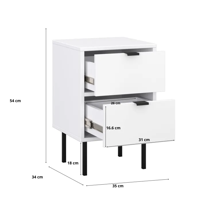 Abmessungen des Nachttischs "KOIDO", zwei Schubladen, schwarze Elemente, weiße Farbe: