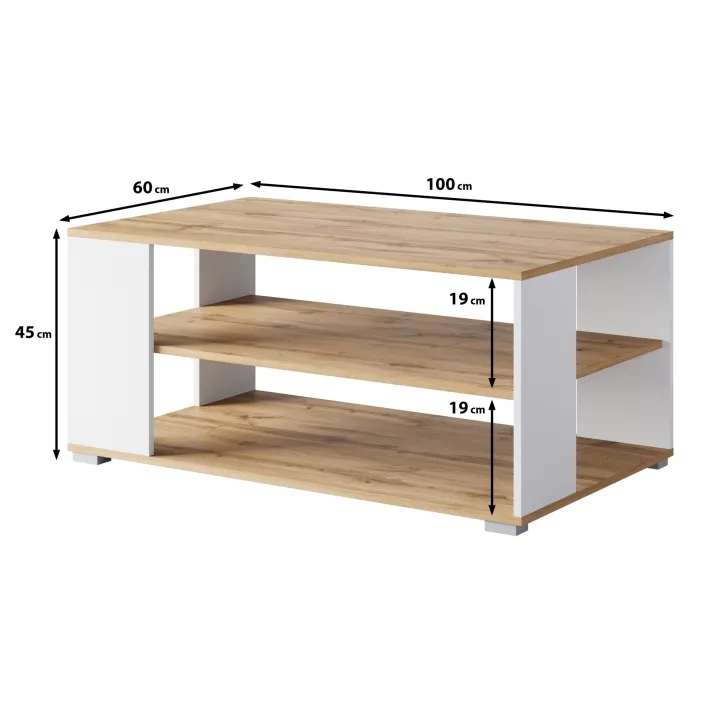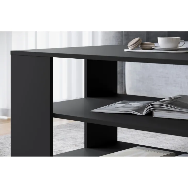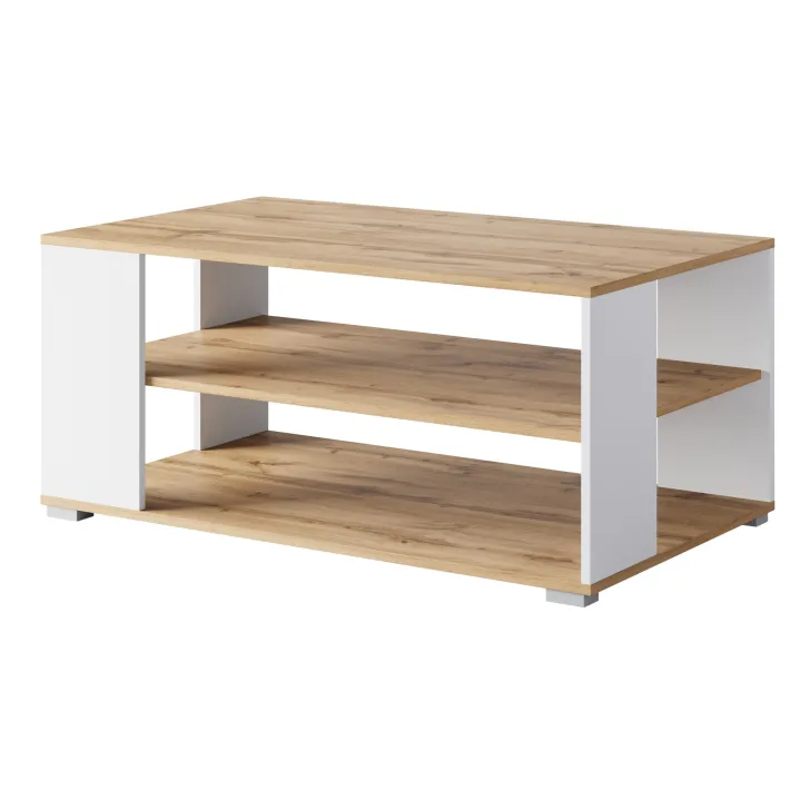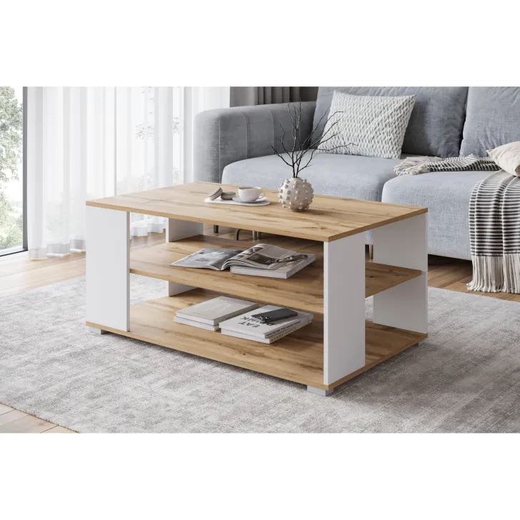 Der Couchtisch NIMFEA I ist in zwei modernen Farbvarianten erhältlich – Schwarz sowie Wotan-Eiche/Weiß – sodass Sie ihn problemlos in Ihr Zuhause integrieren können.